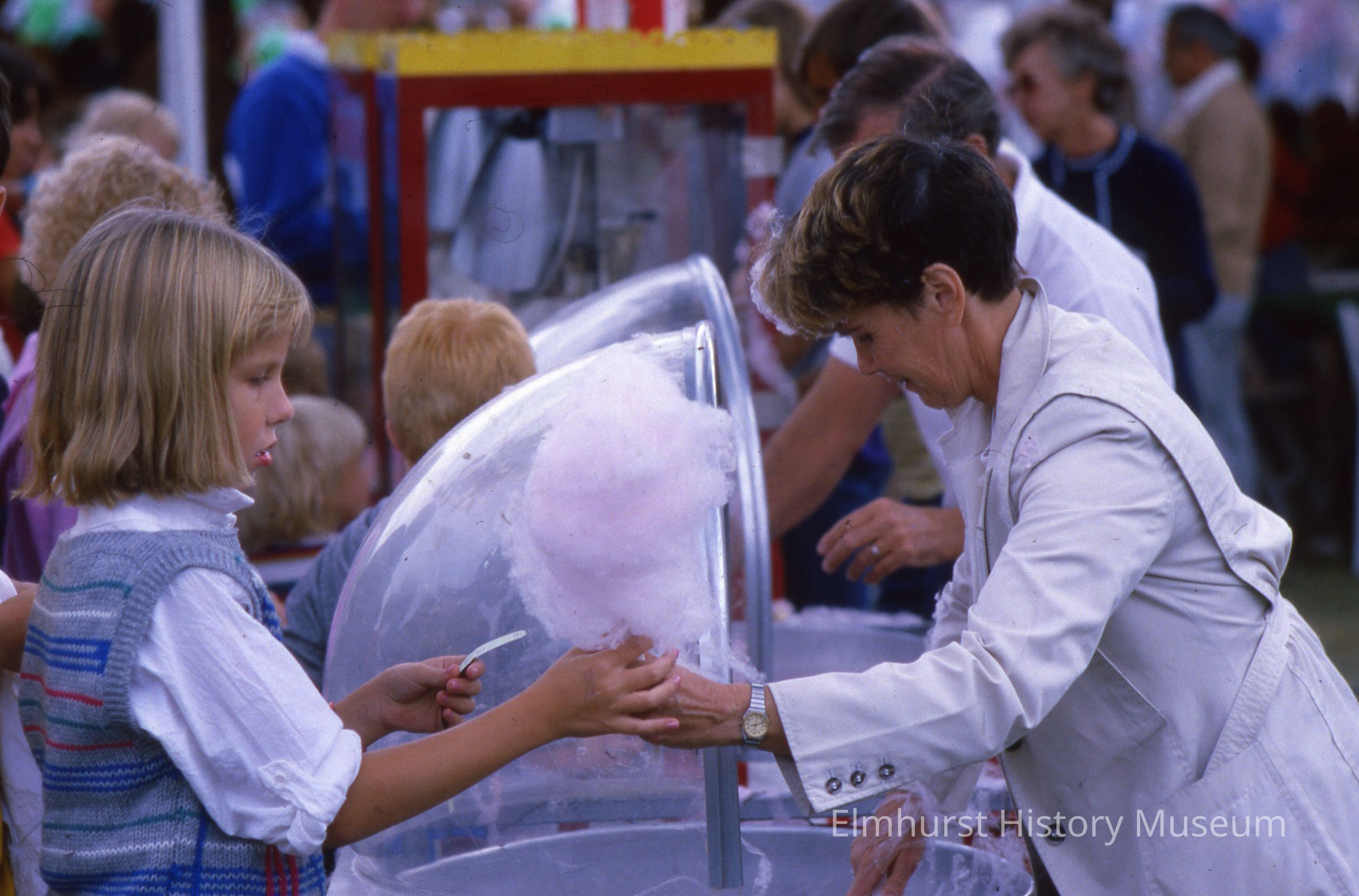 Grounds of York State Bank, 536 S. York Street, during a celebration for Elmhurst's Sesquicentennial; cotton candy.Photograph Details