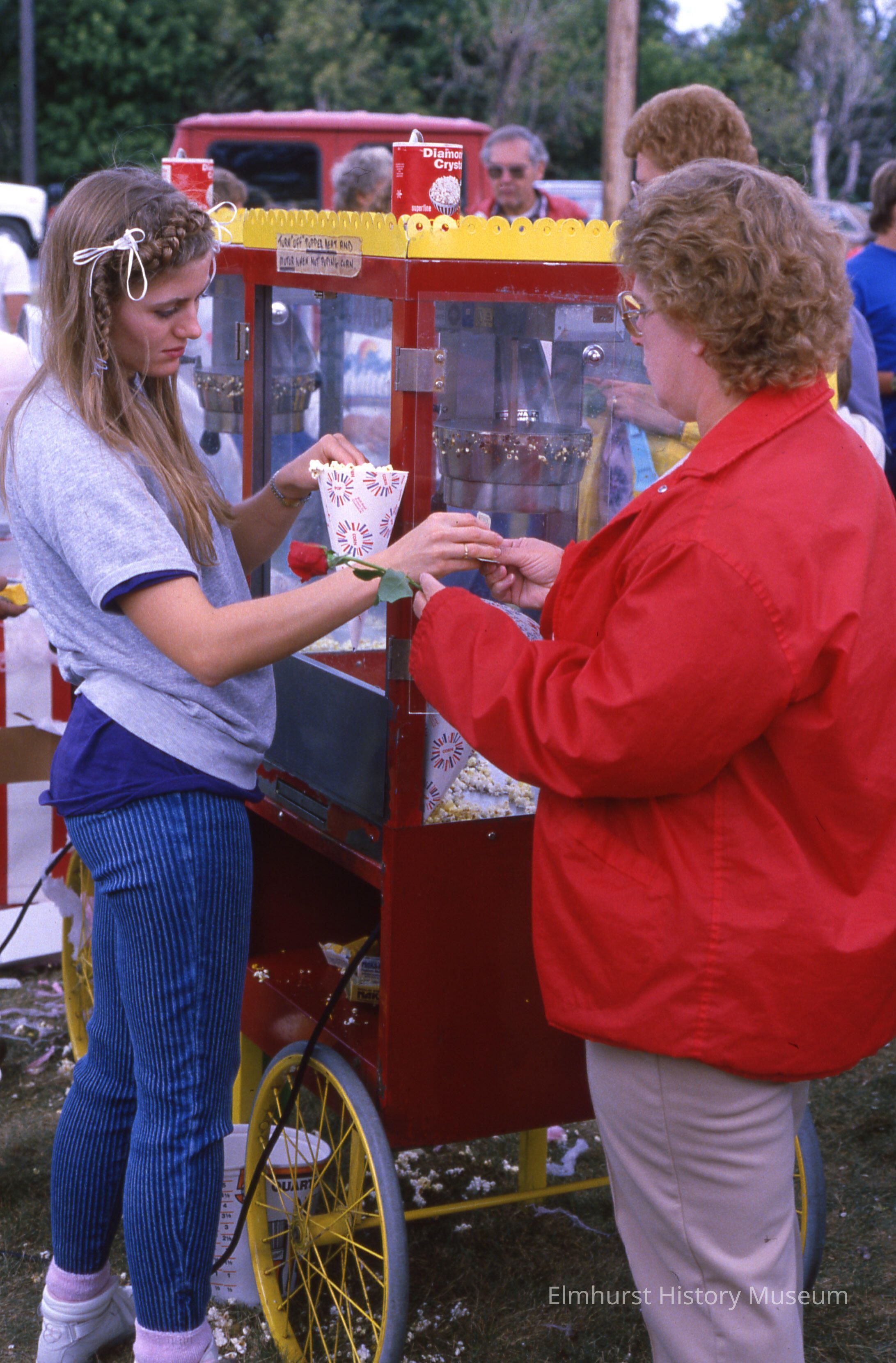 Grounds of York State Bank, 536 S. York Street, popcorn cart during a celebration for Elmhurst's Sesquicentennial.Photograph Details
