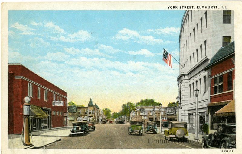 "York Street, Elmhurst, ILL. 4451-29" is printed on the front in black. Written on the back in red (probably by donor) is "Looking North from Adalaide down York St. S-W Corner was called Elmhurst Pharmacy Chambers Ollswangs." Card was published by Elmhurst News Agency with picture by C.T. American Art.Photograph Details