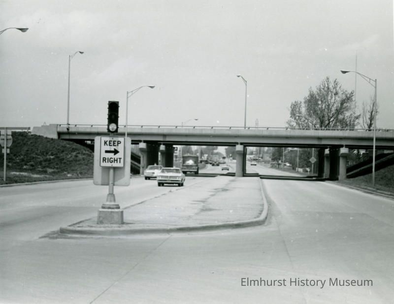 Handwritten in blue ink on back upper left: Elmhurst - Business Sections Handwritten in pencil on back upper middle: York St. North from Lake St. (New Eisenhower Expressway Overpass immediately ahead) Taken May 20, 1966 by R.L. Mahon using Leica with 90 mm lens. Roll 1, frame 7, Panatomic x film Stamped in purple ink on back right: Elmhurst Public Library Elmhurst, ILL.