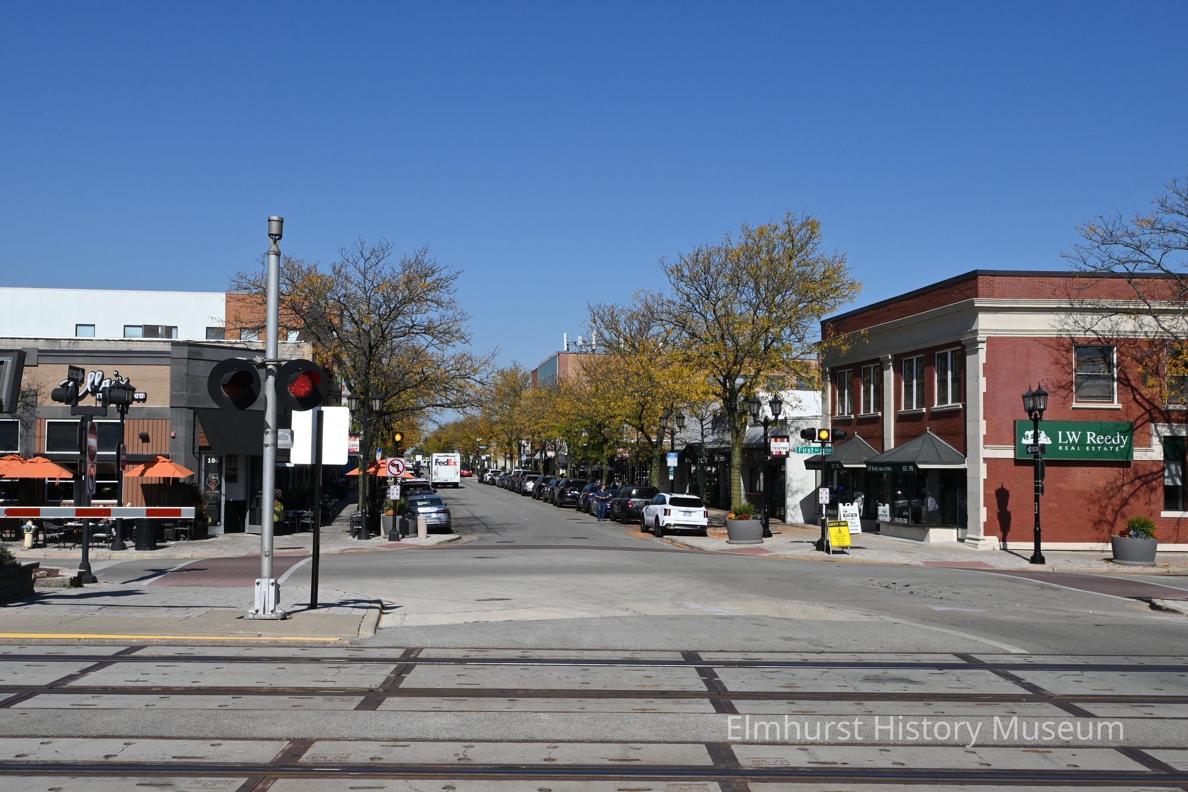 Downtown Elmhurst, looking north on York Street across the railroad tracks from Park Avenue.Photograph Details