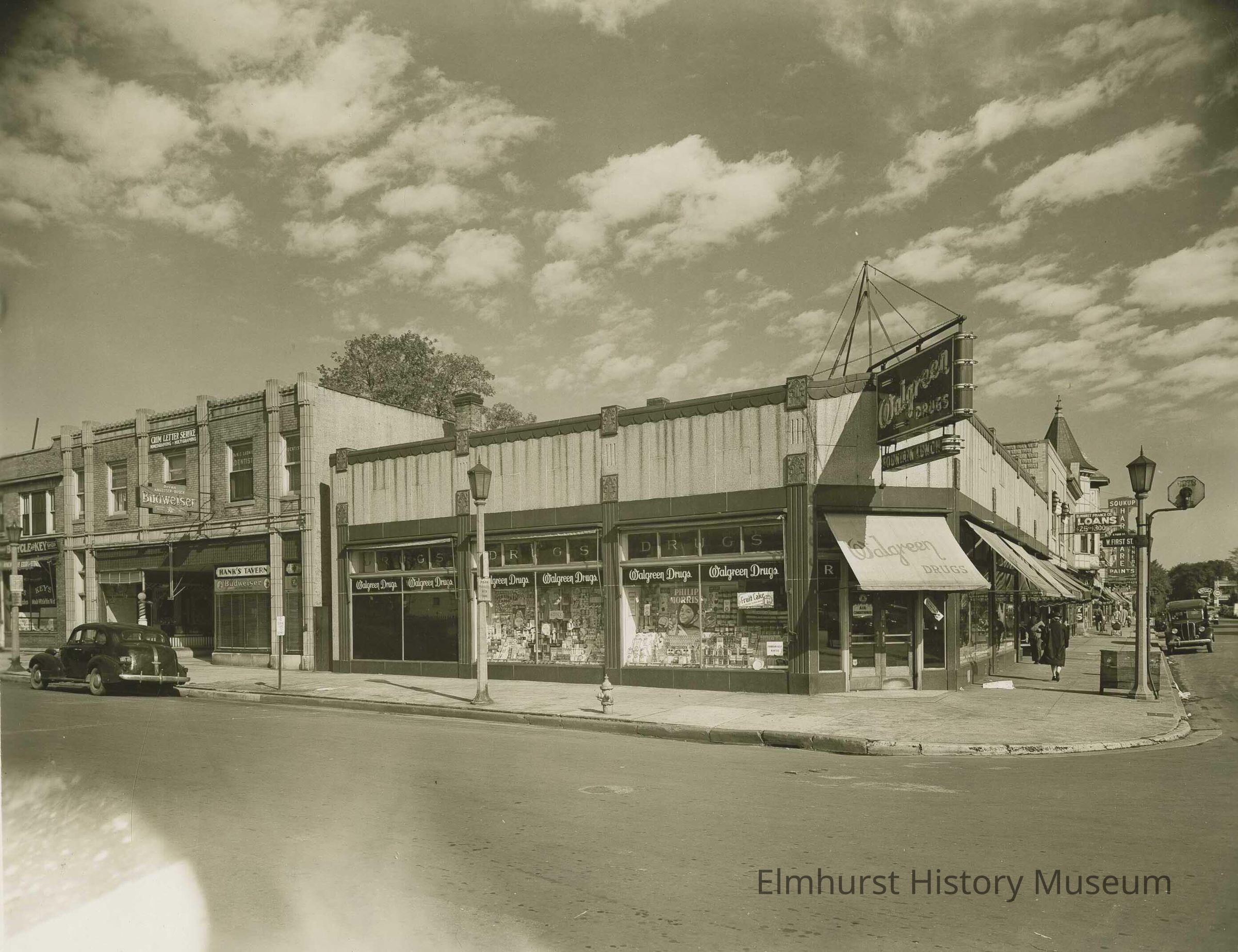 Downtown Elmhurst, looking north and west from the corner of York and First Streets. Walgreen Drug Store is on the corner at 100 N. York Street.Photograph Details