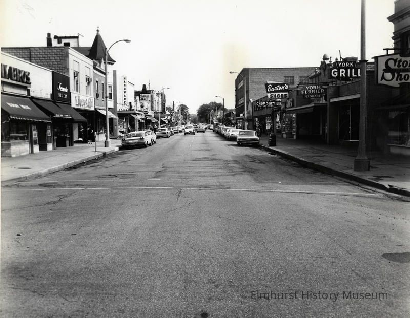 York Street looking north from First Street. Businesses pictured included the York Grill, Burton's Shoes, York Furrier, Elmhurst Chop Suey, Soukups, Surplus Mart, Elm Bowl, York Theater, Honey Girl.Photograph Details