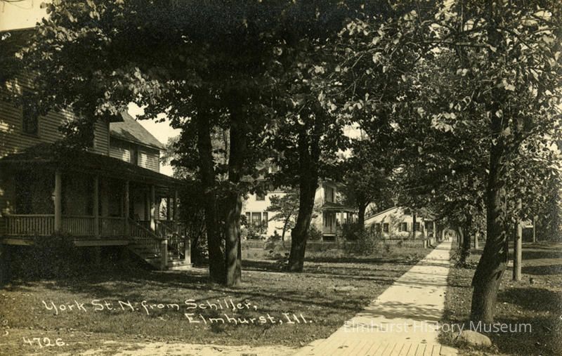 Photographer credit: C.R. Childs Photograph / Post Cards Chicago Printed caption: York St. N. from Schiller / Elmhurst, Ill / 4726 Noted on back: 144 No. York, Keiler residence / A peach & cherry orchard was between the first two homes. Mrs. Hahns (Catherine) took produce all the way to Chicago markets Stamped on back: Elmhurst Historical Commission