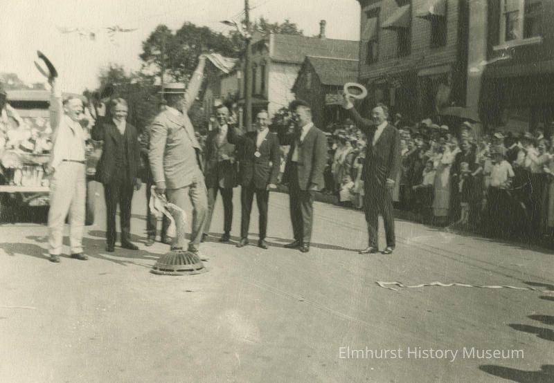 Elmhurst City officials at the ribbon-cutting ceremony for the newly-paved York Street. Looking north from First Street on Labor Day 1921.Photograph Details