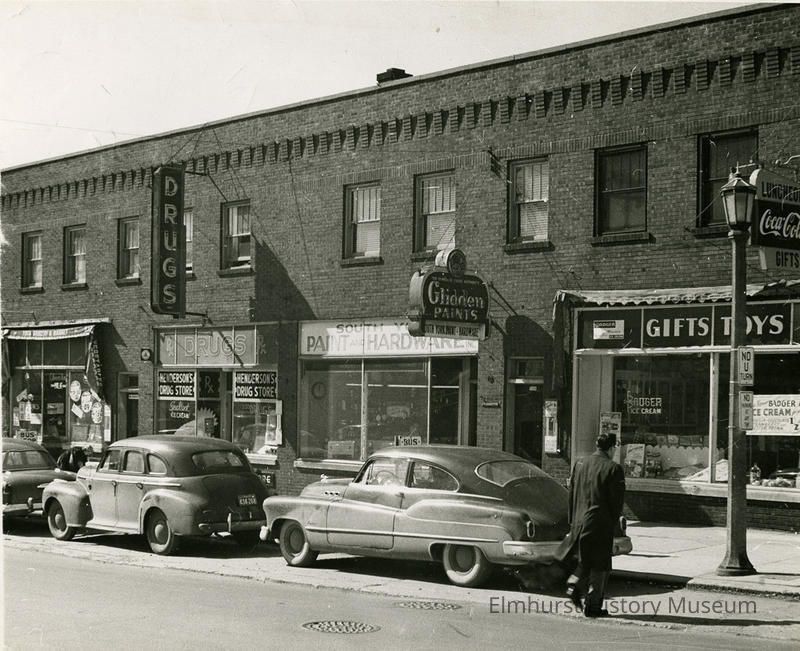 Pencilled on back: Commercial Block on S. York, c.1949/526 Snack Shop/528 South York Paint & Hardware/530 Henderson's Drug Store/532 York Grocery and Meat Market Ic-1-Business-Henderson's Drug Store