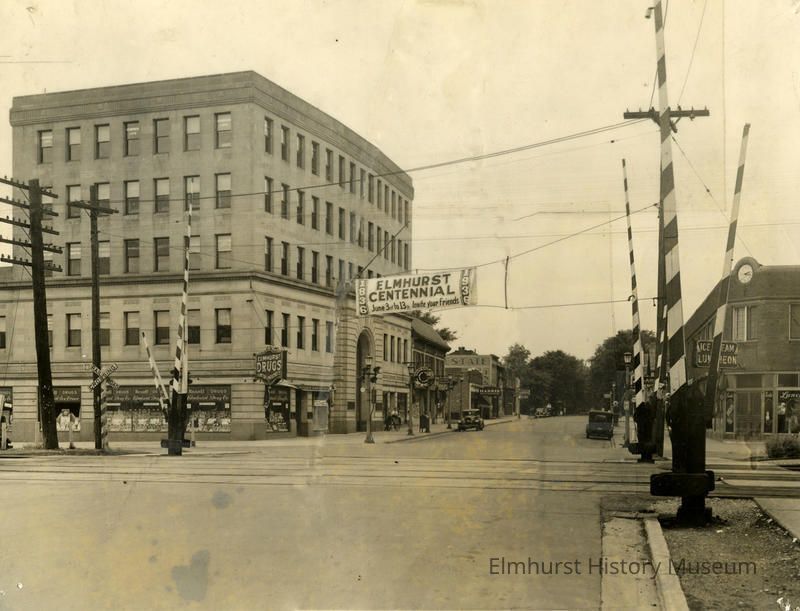 York Street looking south from First Street showing Elmhurst Centennial banner strung across York Street. Elmhurst State Bank is at left.Photograph Details