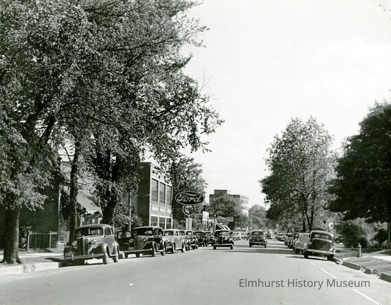 Handwritten in black pen on back upper left: Elmhurst - Business sections York Street south from Third Street - 1941 Photo - Mrs. J. Twiss Handwritten in pencil on back upper right: No 76 Handwritten in pencil on back middle right: #279 York St. South from 3rd St. Sept 1, 1941 Photograph by Mrs. J. Twiss