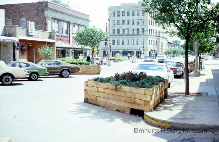 N. York Street looking south towards First Street, featuring the parking barriers enabling angle parking.Photograph Details