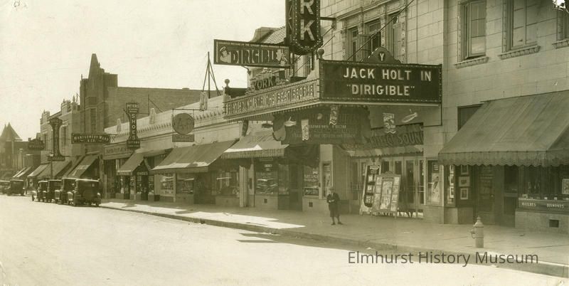 Photo is stamped on the back with "ELMHURST / HISTORICAL/ COMMISION" in rectangular outline and written notation identifies "York Theater, west side of York St. / east (under west, lined through)."