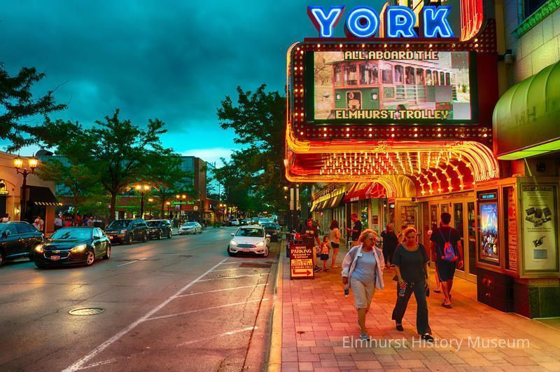 View of the York Theatre at 150 N. York Street, looking south towards Schiller Street. The Elmhurst Trolley is being advertised on the marquee.Photograph Details