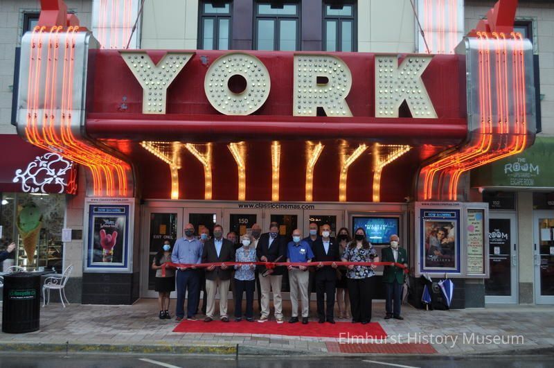 Elmhurst Chamber of Commerce and Industry ribbon cutting ceremony celebrating reopening of the York Theatre at 150 N. York following the lifting of restrictions during the Covid-19 pandemic lockdown. Pictured officials include owners Willis and Shirley Johnson, son Chris Johnson, Chamber of Commerce president and CEO John Quigley, City Manager James Grabowski, Assistant City Manager Mike Kopp, Business Development Coordinator Erin Jason, Elmhurst aldermen and other Chamber of Commerce members.Photograph Details