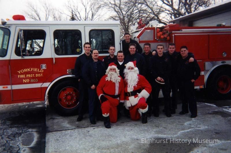 Yorkfield Fire Department celebrates Christmas. Two firemen are dressed as Santa Claus.