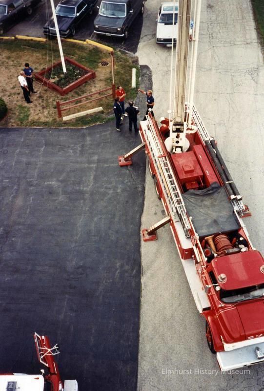 View of a fire truck from a ladder at the Yorkfield Fire Department at S. York and Lexington
