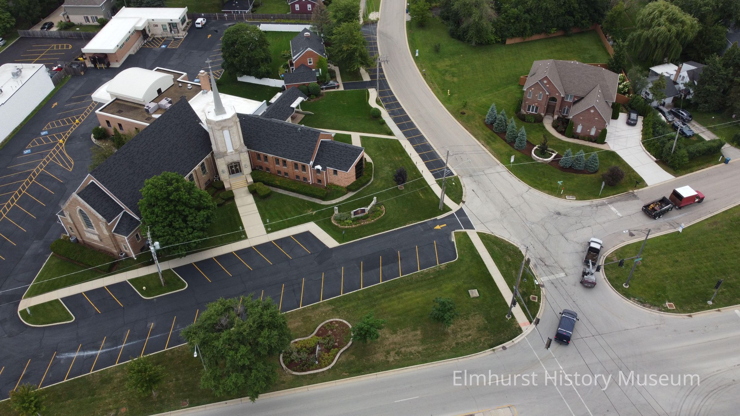 Aerial view of Yorkfield Presbyterian Church at 1099 S. York Street, on the northeast corner of S. York Street and Lexington Street.Photograph Details