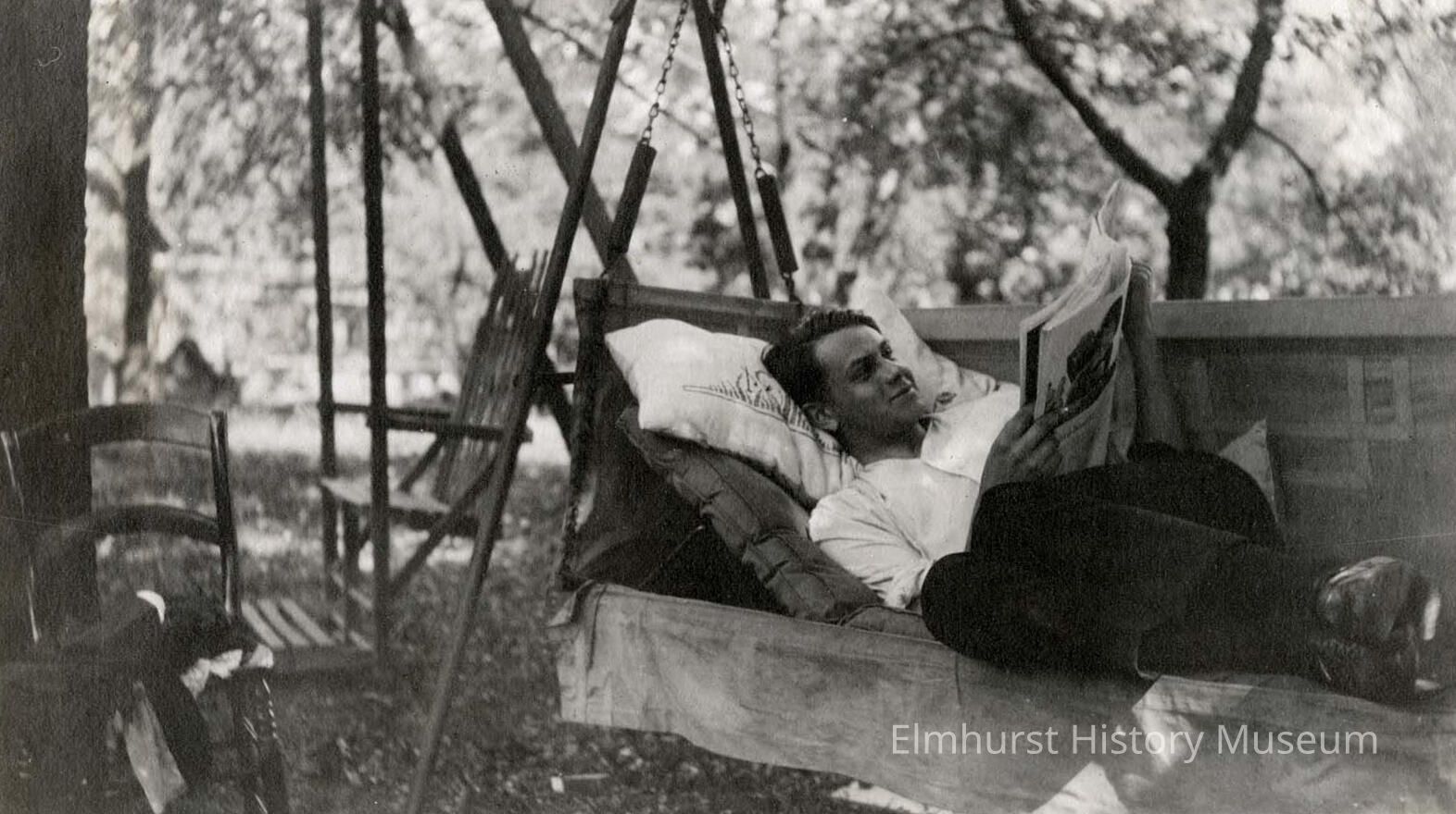 A young man, possibly Arthur Schumacher, reads a magazine on a swing bench.Photograph Details