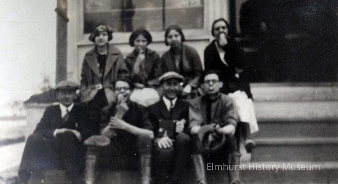 Group of youths sitting on the front steps of an ice cream parlor or drug store eating ice cream.Photograph Details