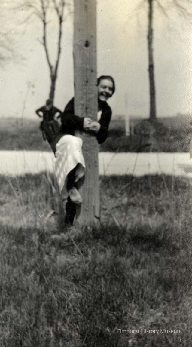 A young woman grabs a telephone pole with North Avenue in the background.Photograph Details
