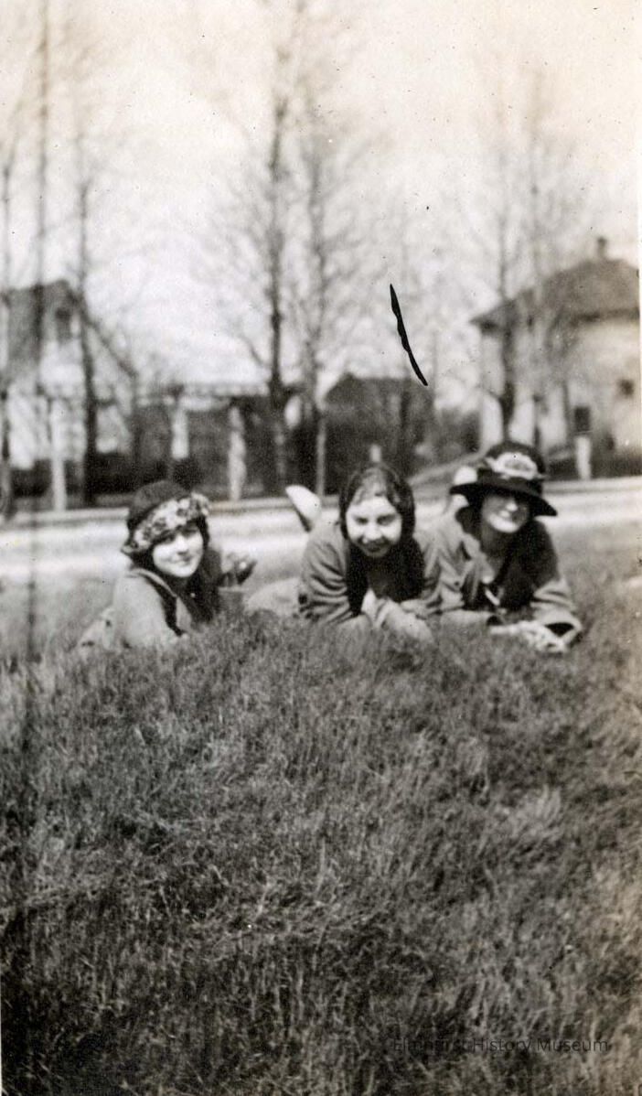 Three young women pose for a photo laying on a lawn. Laura Schumacher Raab is at middle. Amanda Weiser is possibly at right.Photograph Details