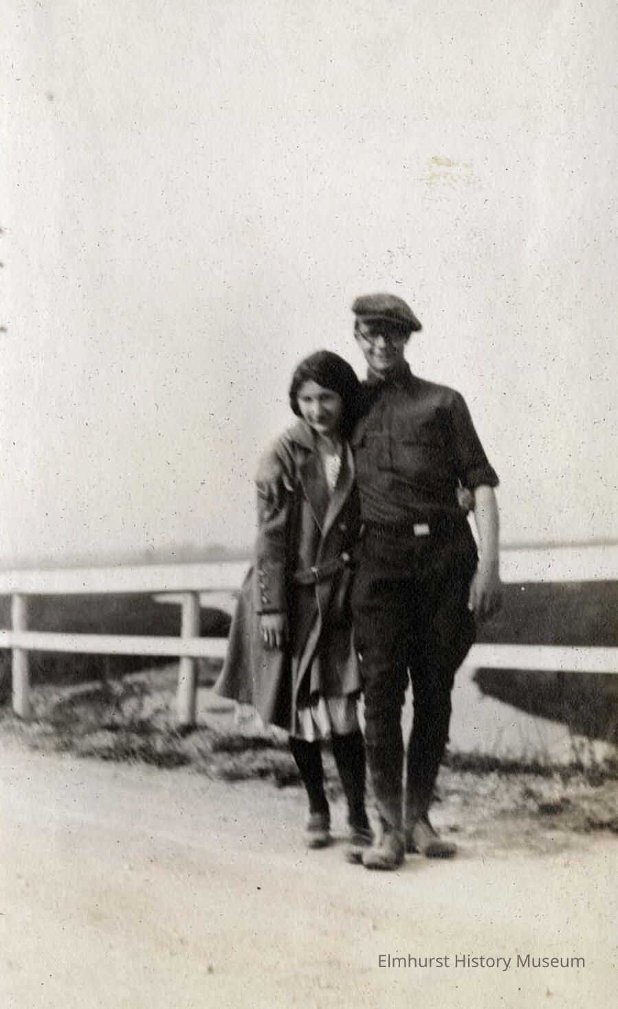 A young couple pose for a photo with a road in the background (possibly North Ave).Photograph Details