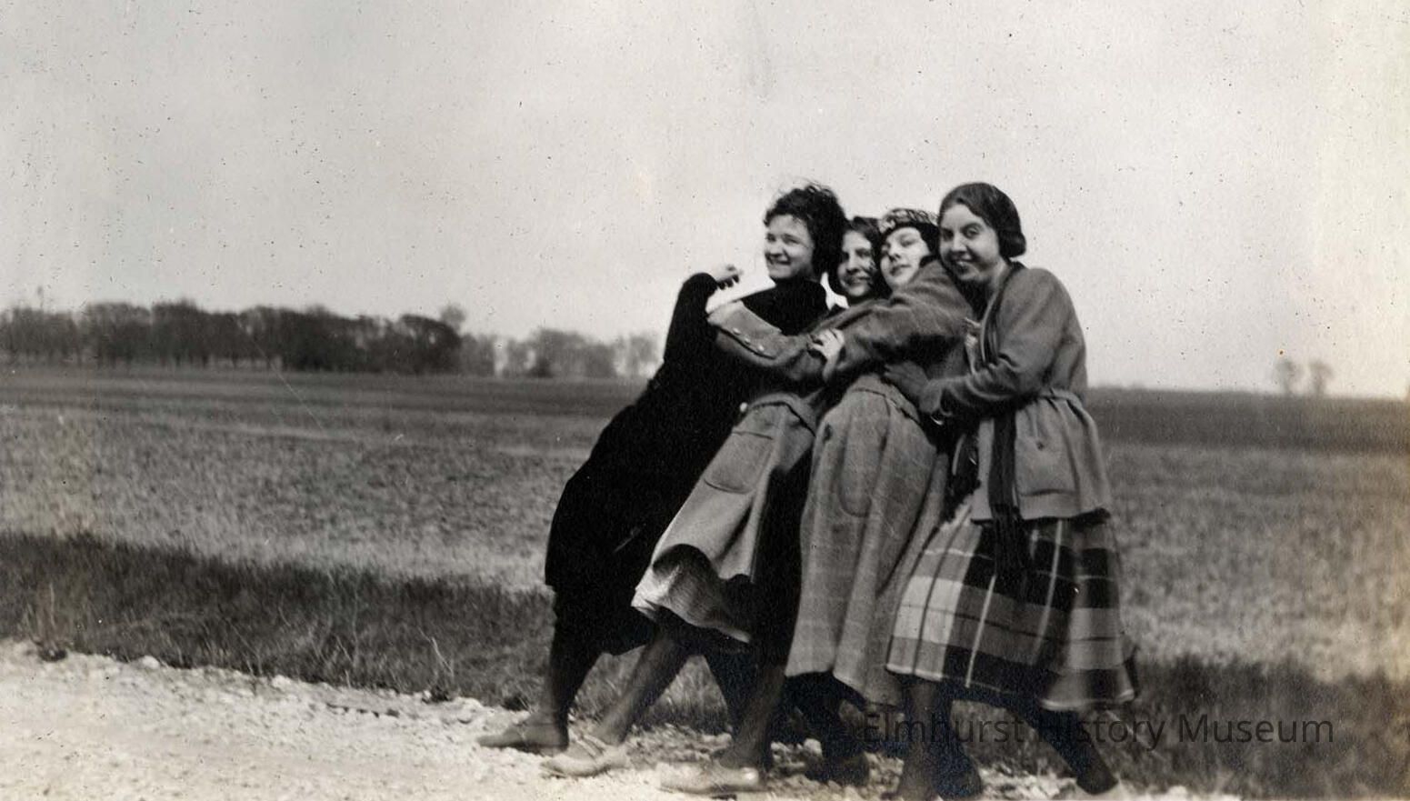Four young women pose for a photo with a road in the background (possibly North Ave). Woman at far right is Laura Schumacher Raab. Woman second from right is possibly Margaret Franzen Brittain.Photograph Details