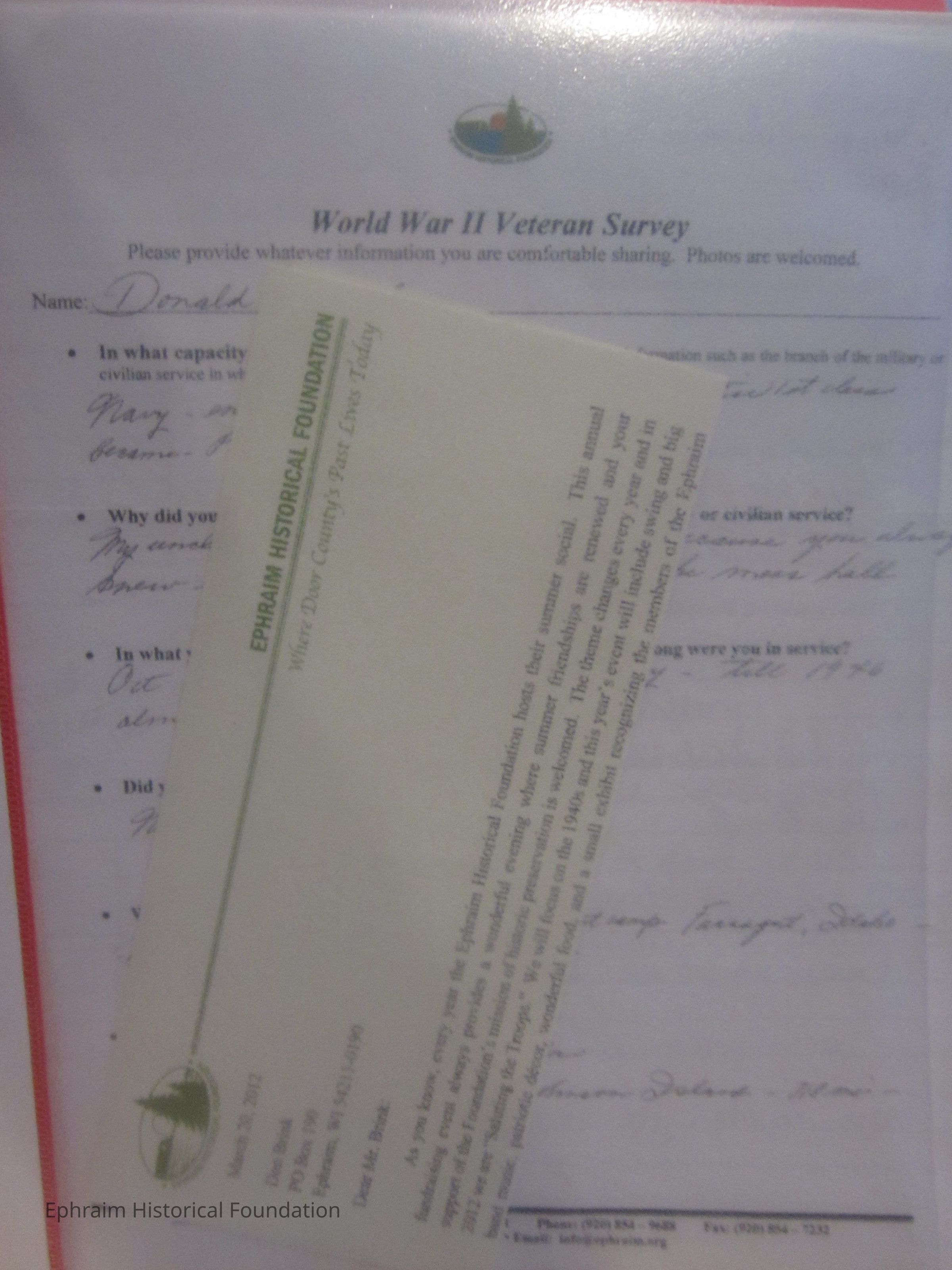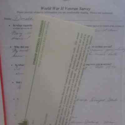 Collection of surveys of EHF members who served in WWII. Includes responses from Donald Brink, O.C. Boldt, Robert (Bob) Davis, John Fraser Hart, Dellmont Lindbloom, and Malcolm Vail.Collection