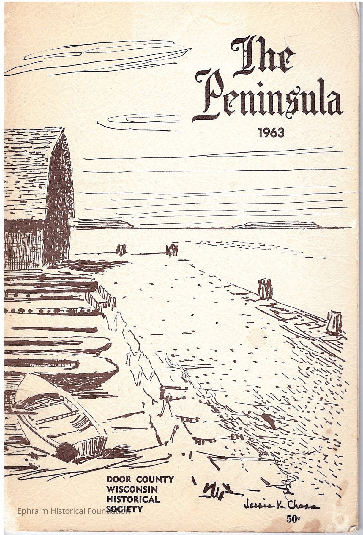 Booklet published by the Door County Historical Society with various history articles. Volume 7, Summer 1963. Cover drawing by Jessie Kalmbach Chase.