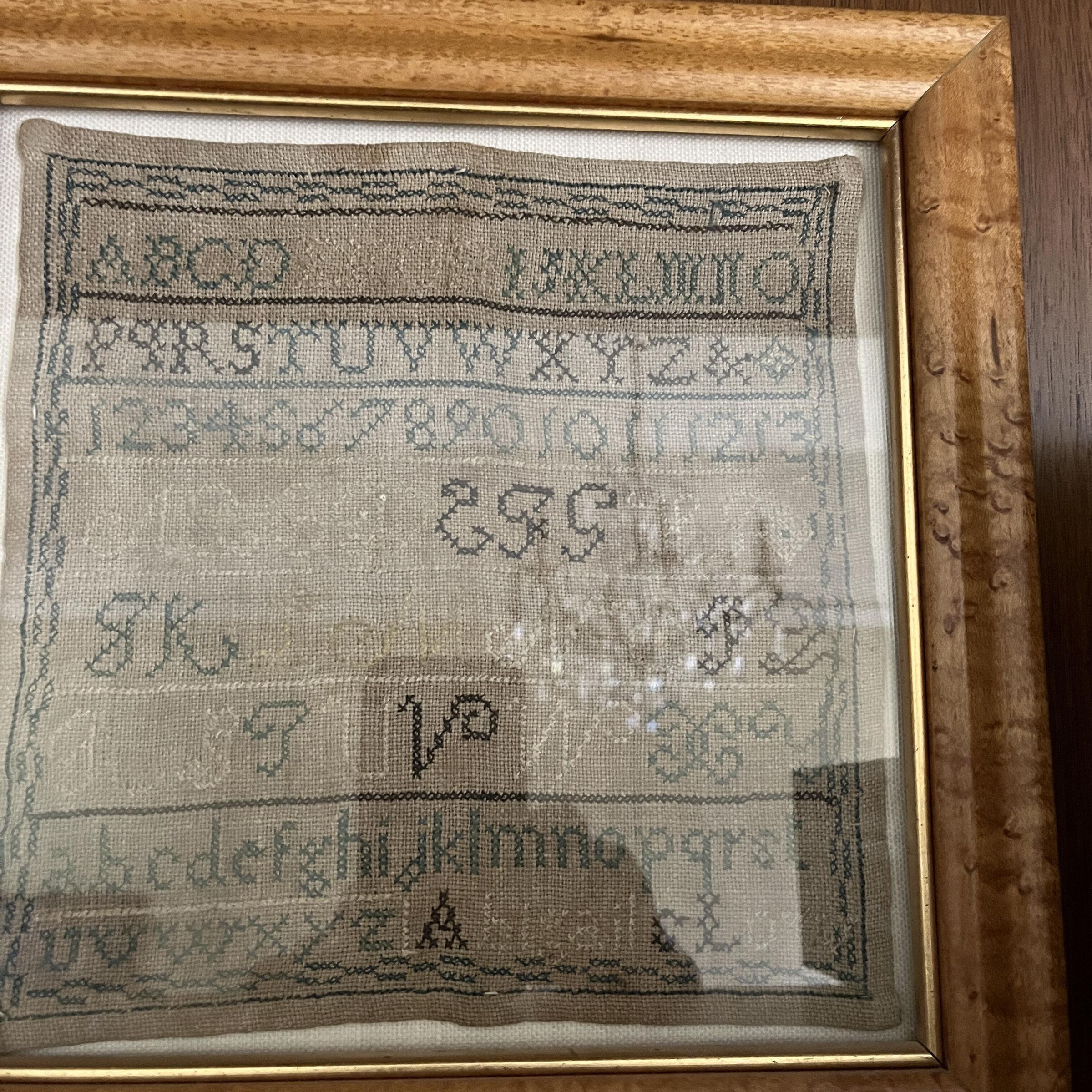 The small sampler with teal blue dashed border enclosing upper case letters, the numbers 1-13, uppercase letters and lowercase letters; burlwood frame, glassCollection