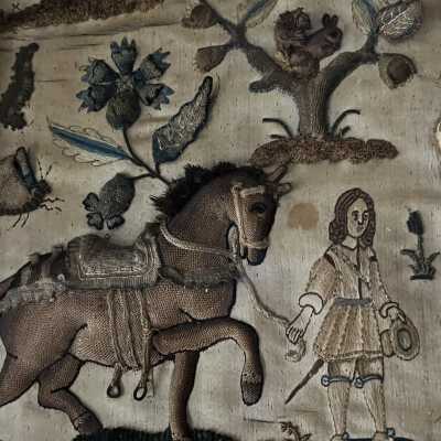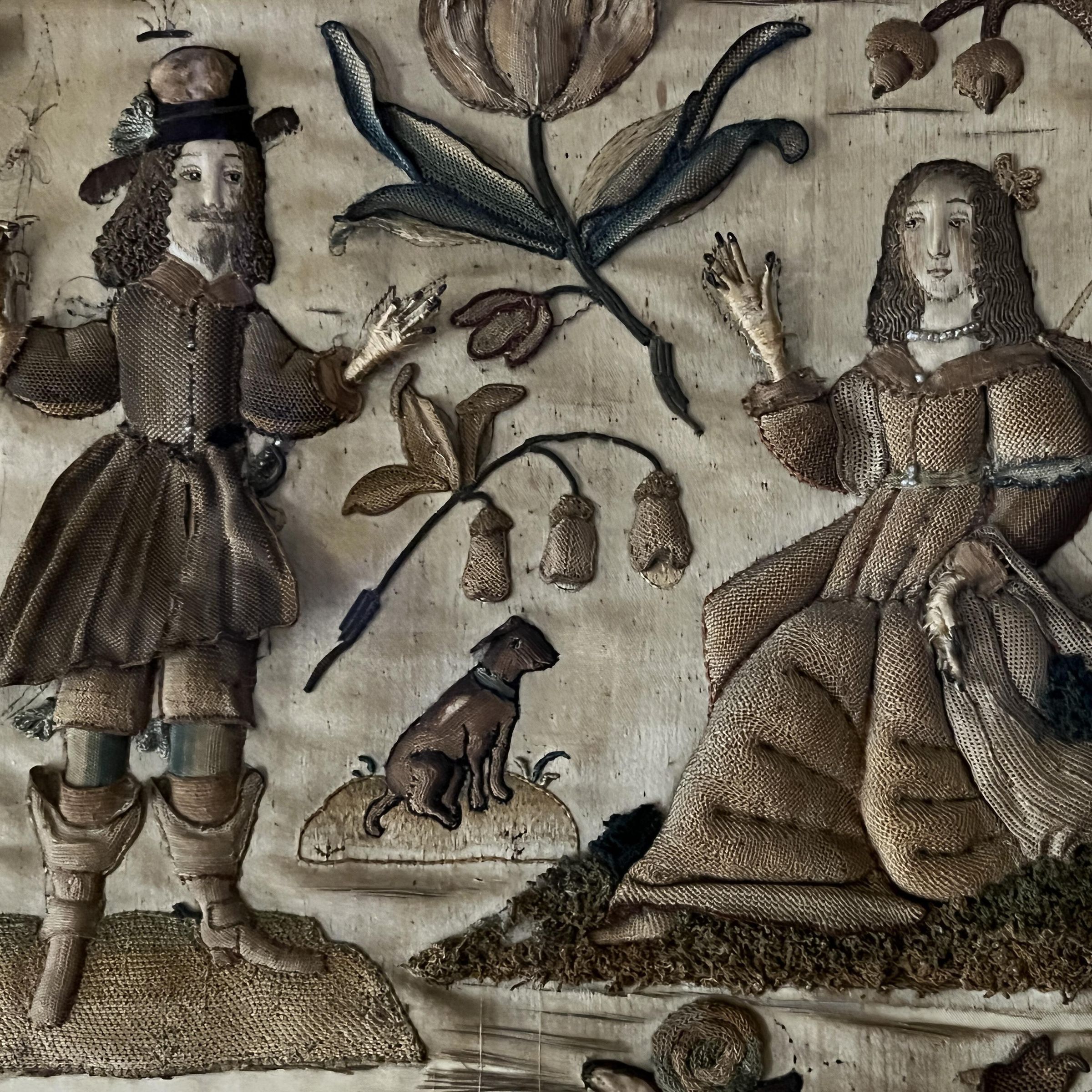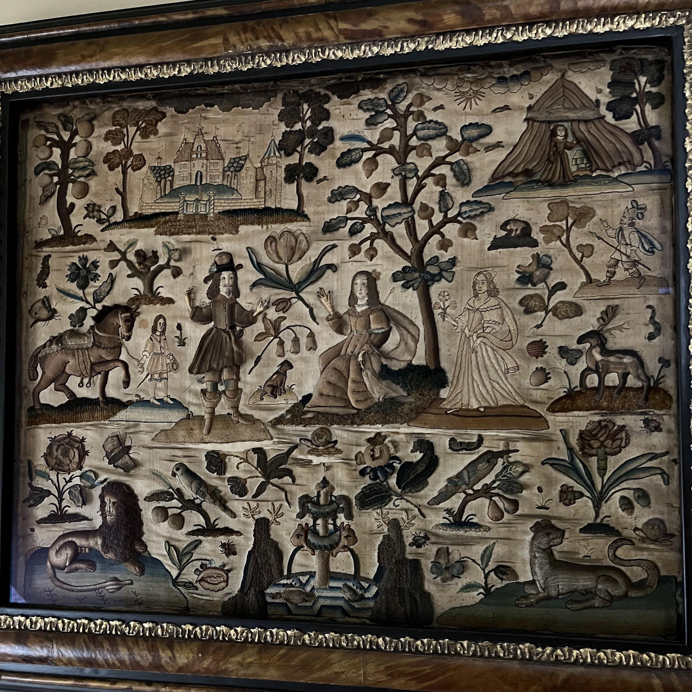 Typically these Stumpwork embroidery scenes would be panels on caskets. This one is very large, and it is unclear if that is how it was originally used.Context