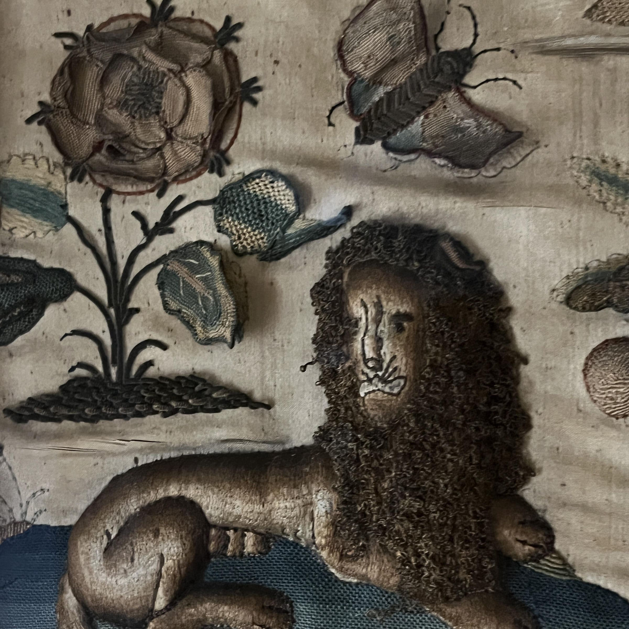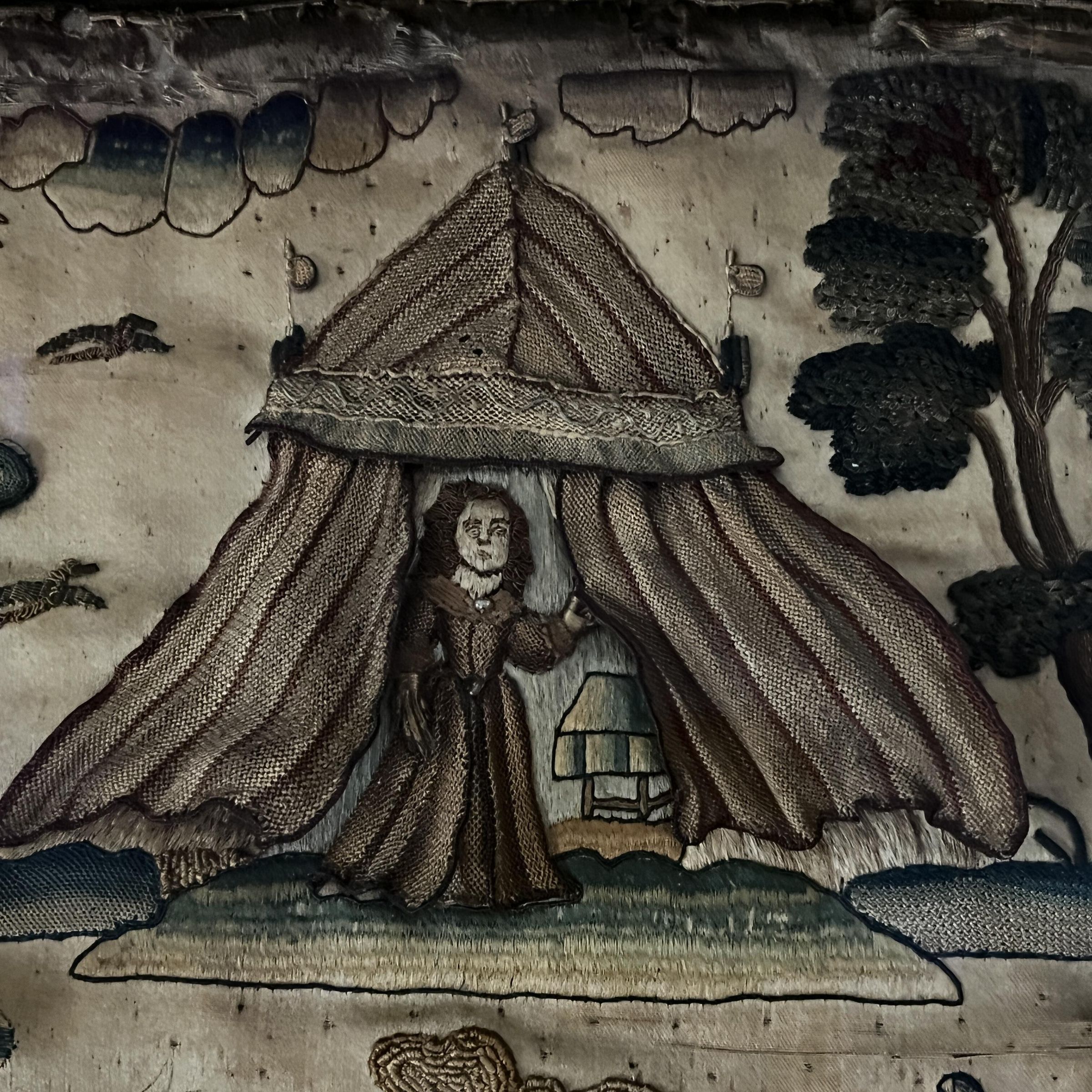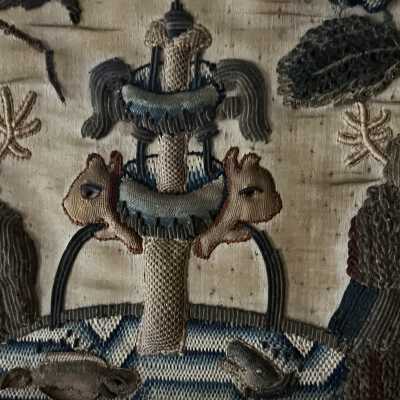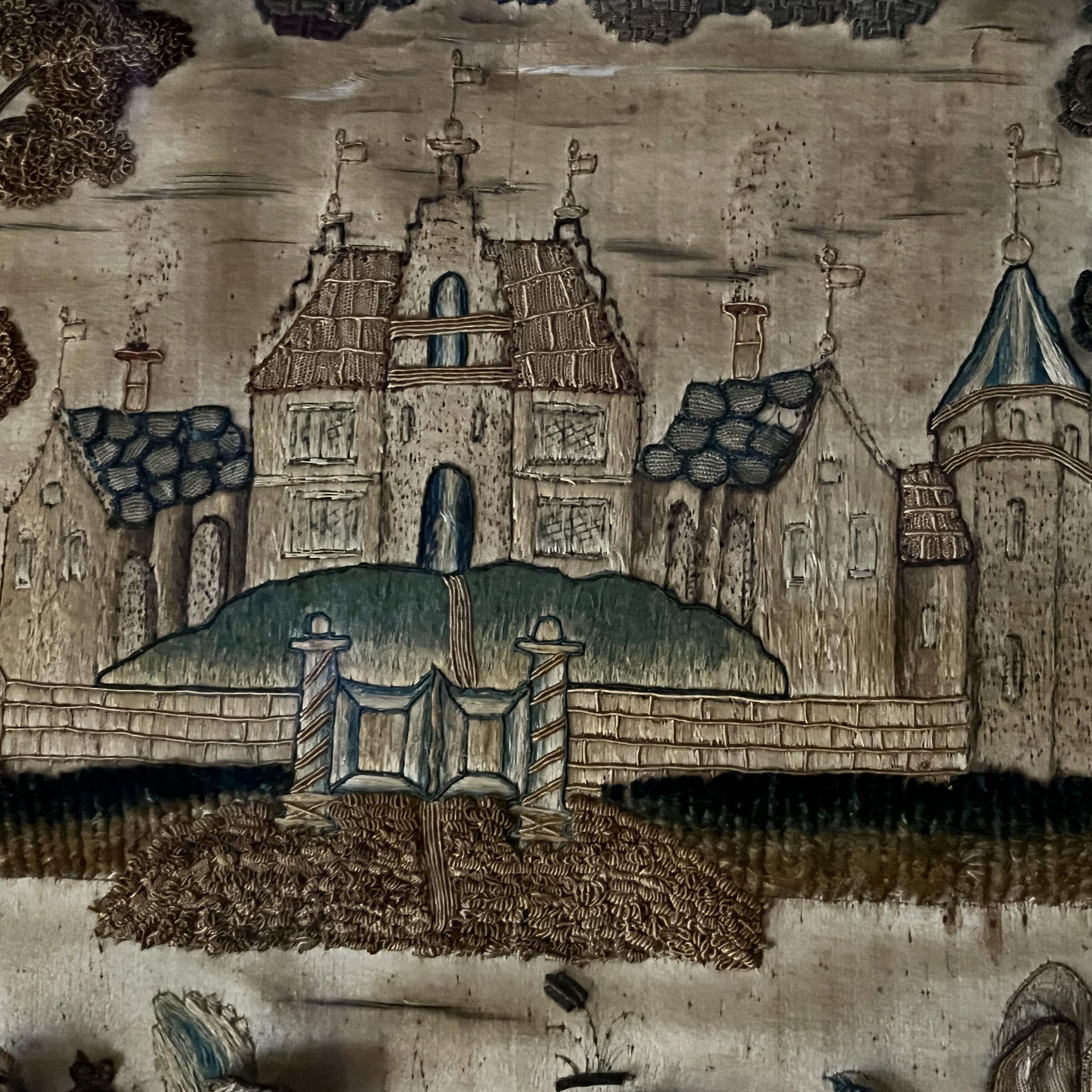 Typically these Stumpwork embroidery scenes would be panels on caskets. This one is very large, and it is unclear if that is how it was originally used.Context