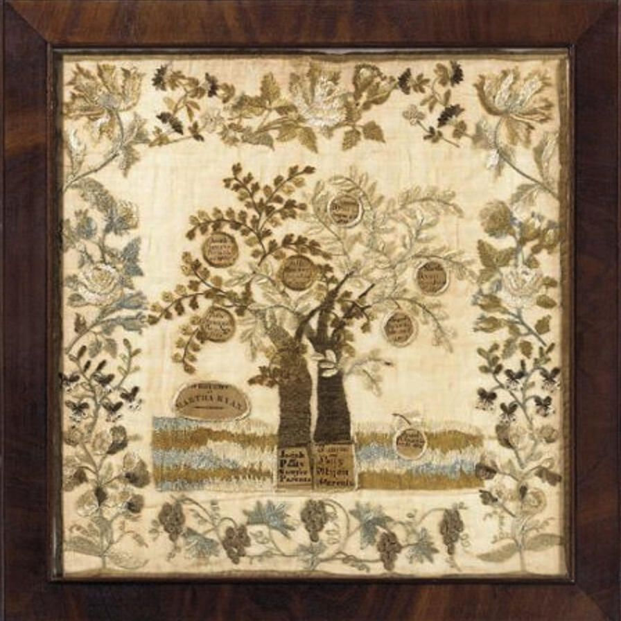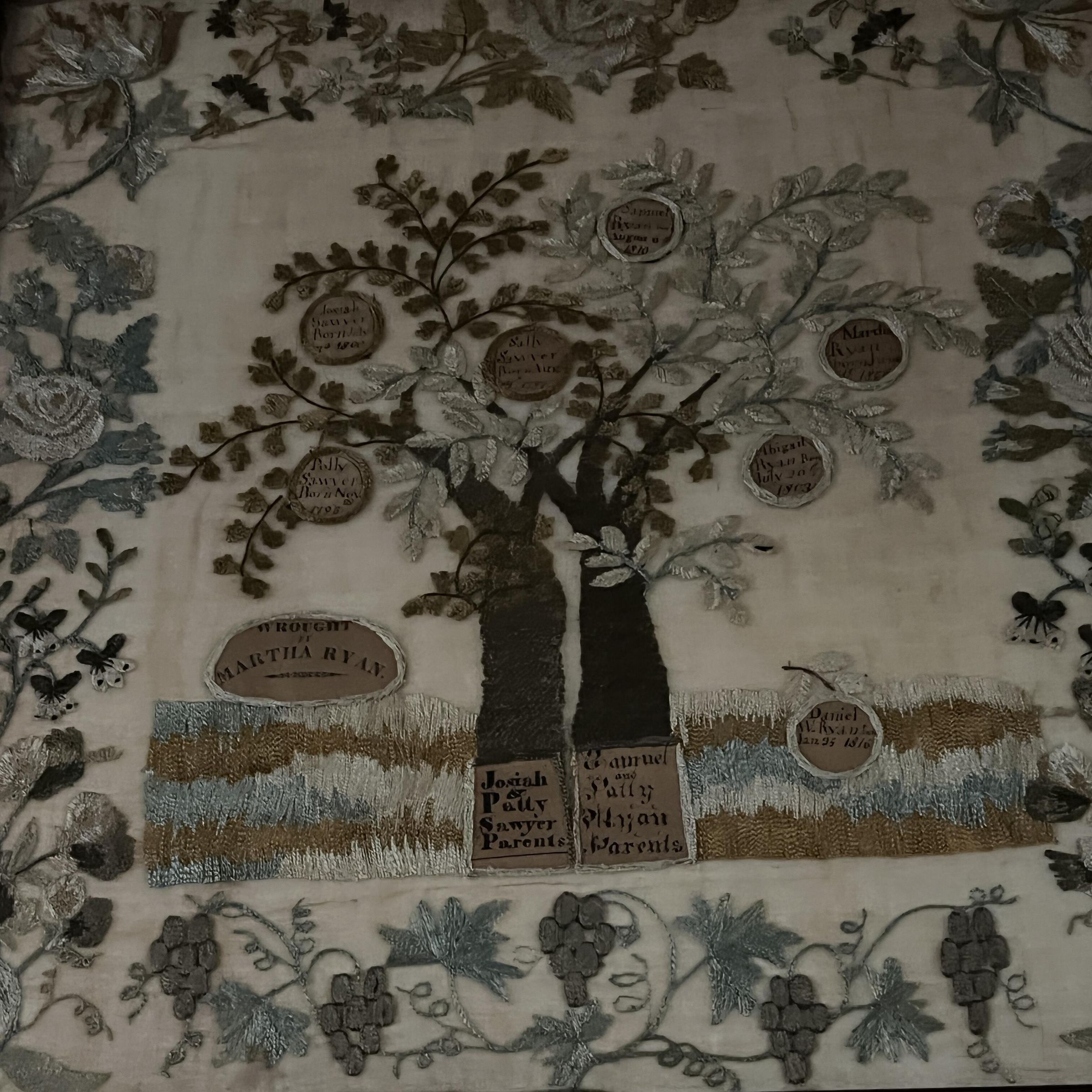 The fine linen gauze with two separate but intertwined trees, one with ivory and green the other with gold and brown leaves, each filled with inscriptions of the name and birth date of each child in an apple form, written in ink on paper; one fallen apple in lower right representing a deceased child; the trunks of each tree inscribed on left :Josiah and Patty Sawyer, parents" on the right, "Daniel and Patty Ryan, parents"; the border depicting various vinate and floral designs; mahogany frameContext