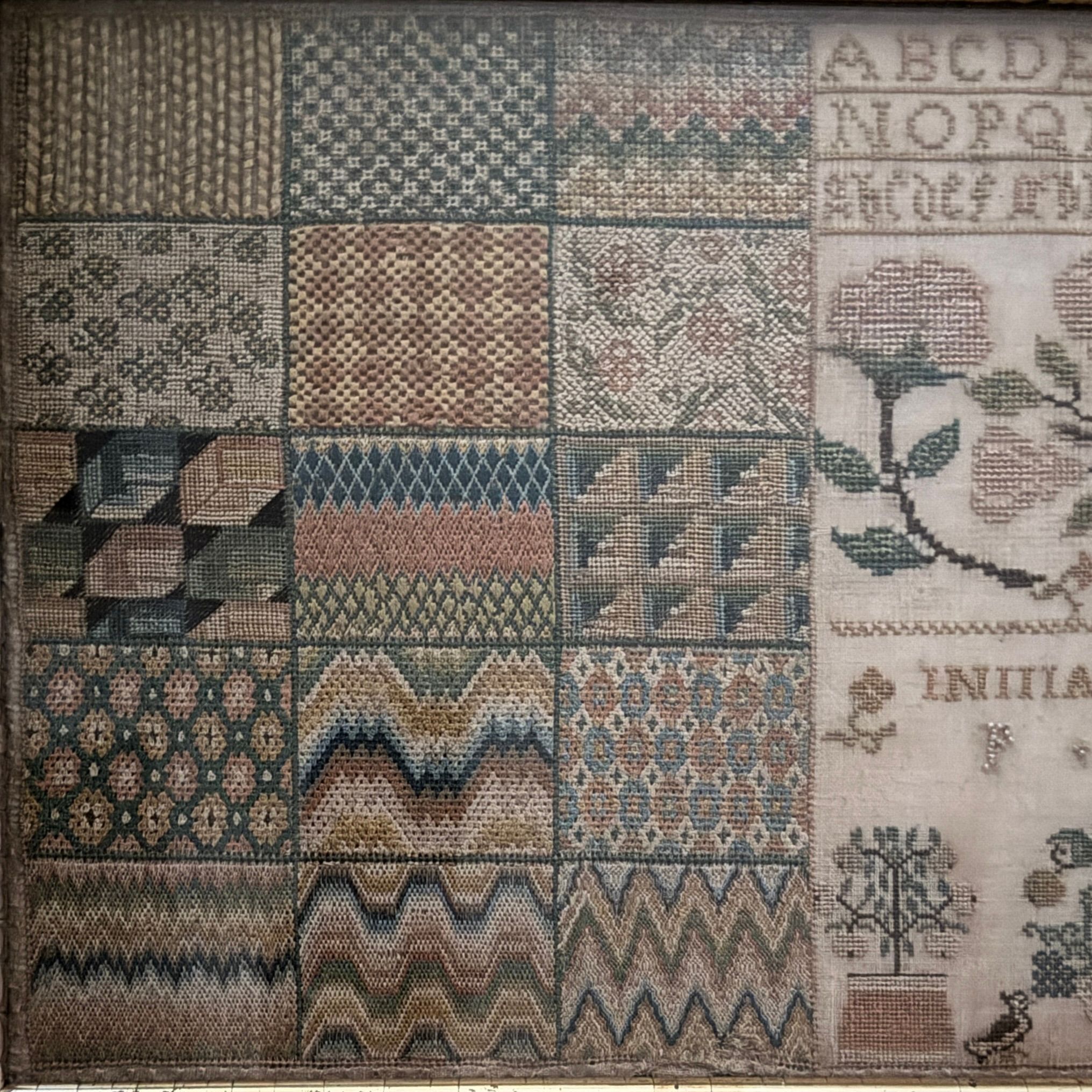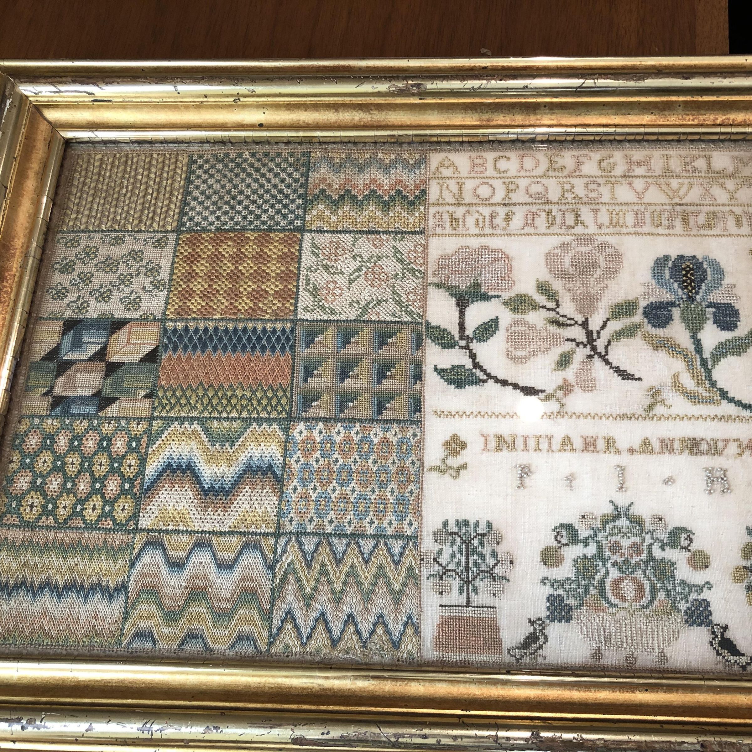 The left half of the 15 rectangular blocks, each showing a different , intricate needlework pattern; the right half organized in three bands, the top two alphabets, the middle with three large flowers, and the bottom with an intricate basket of fruit and flowers, two potted fruit trees and little birds, with the maker's initials embroidered in seed pearls; gilt frame.Use