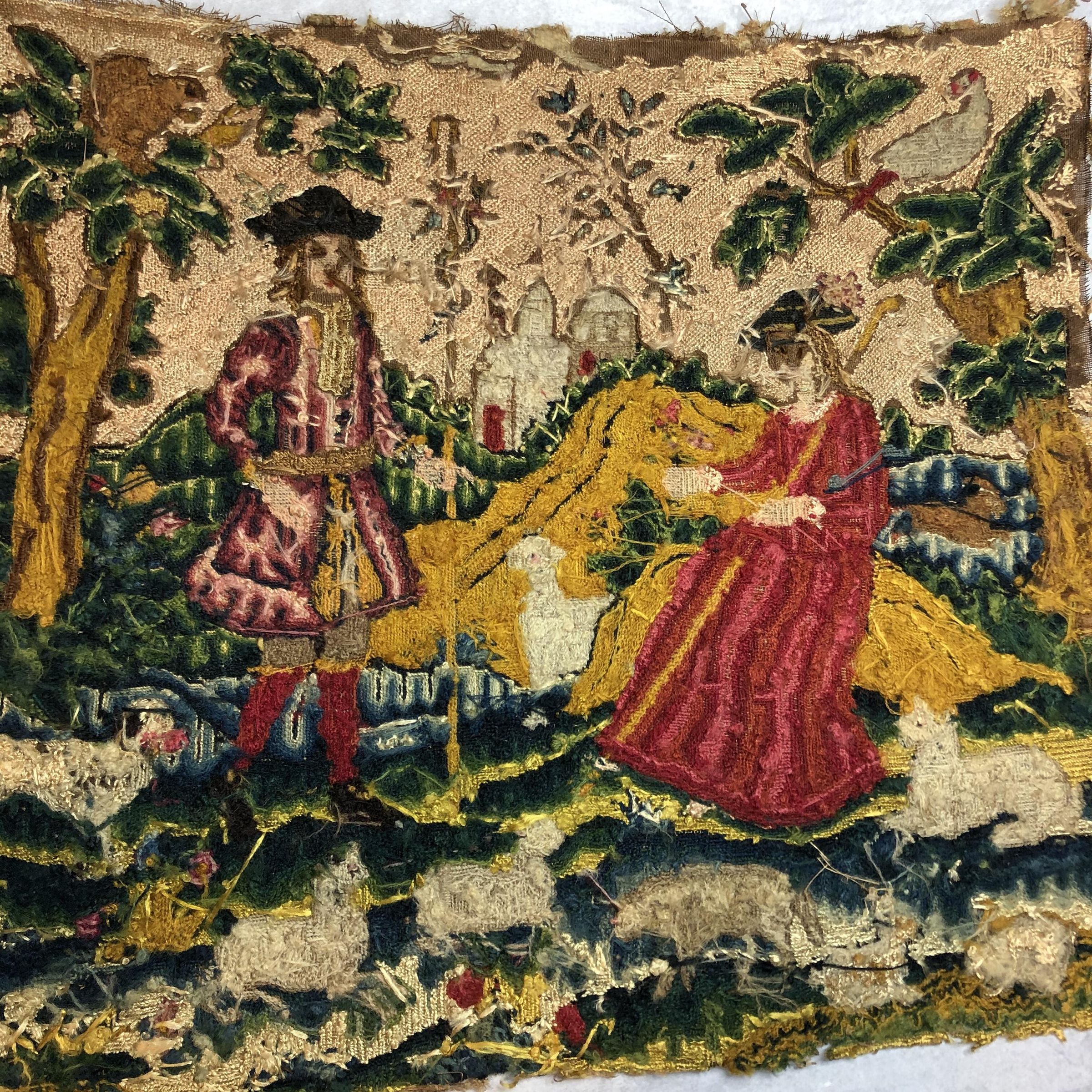 Tent stitched pictures often imitated tapestries. Women could create these scenes to embellish their homes with scenes of pastoral love.Collection