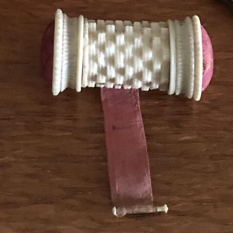 The cylincrical tape measure carved in stacked segmented pattern and topped by red velvet pincushion, containing a red silk measuring tapeUse