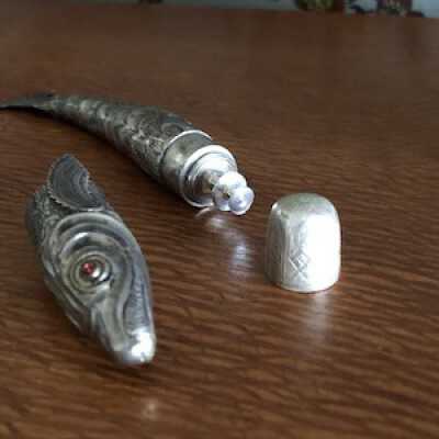 A fun companion to keep with you to store your sewing and needlework tools. The head removes for access to a silver thimble, tucked below the thimble is a thread bobbin and the fish separates mid-way for access to the needle case.Collection