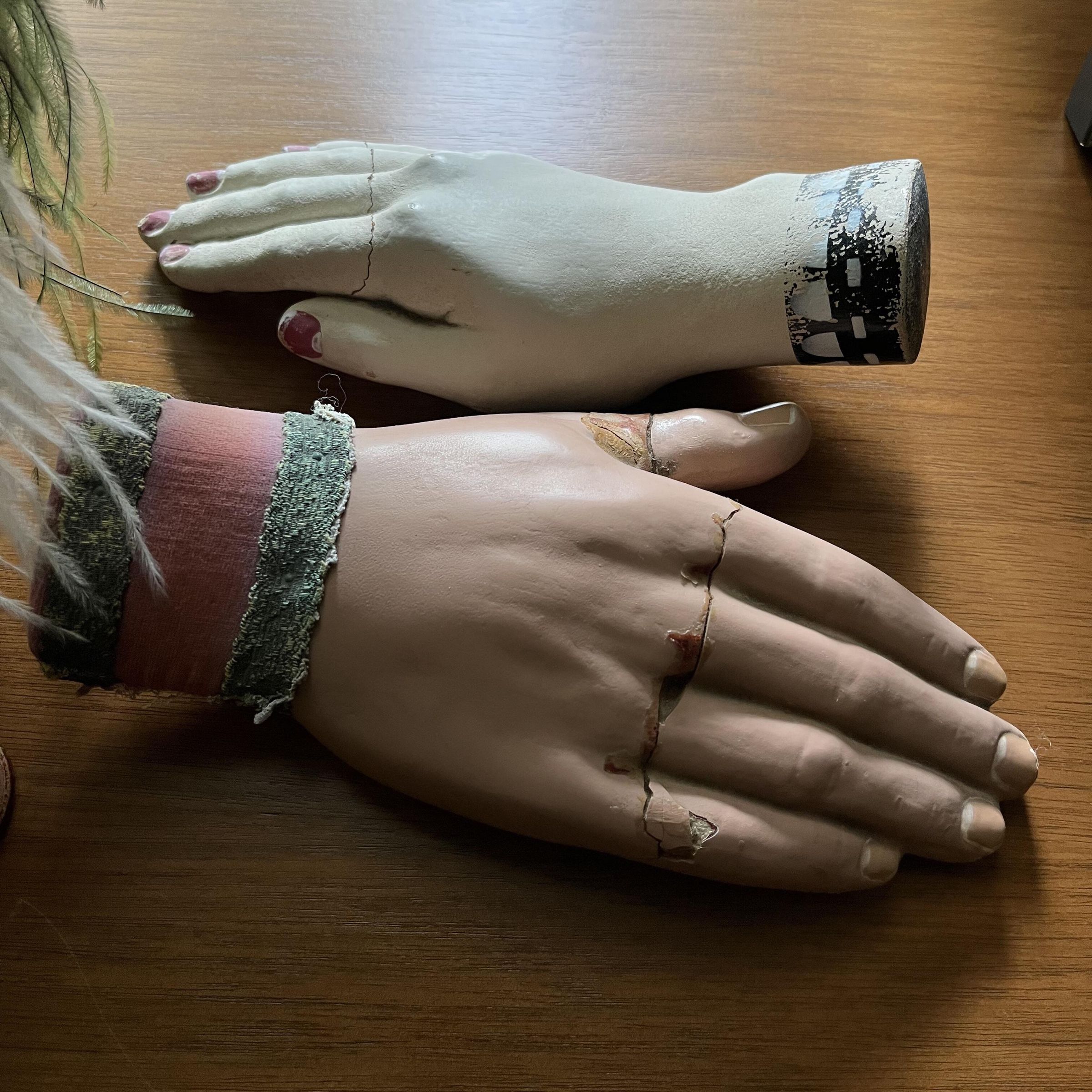 Wooden hands, one with painted fingernails and cuffs, the other wtih fabric cuff in red velvet with green trim.Use