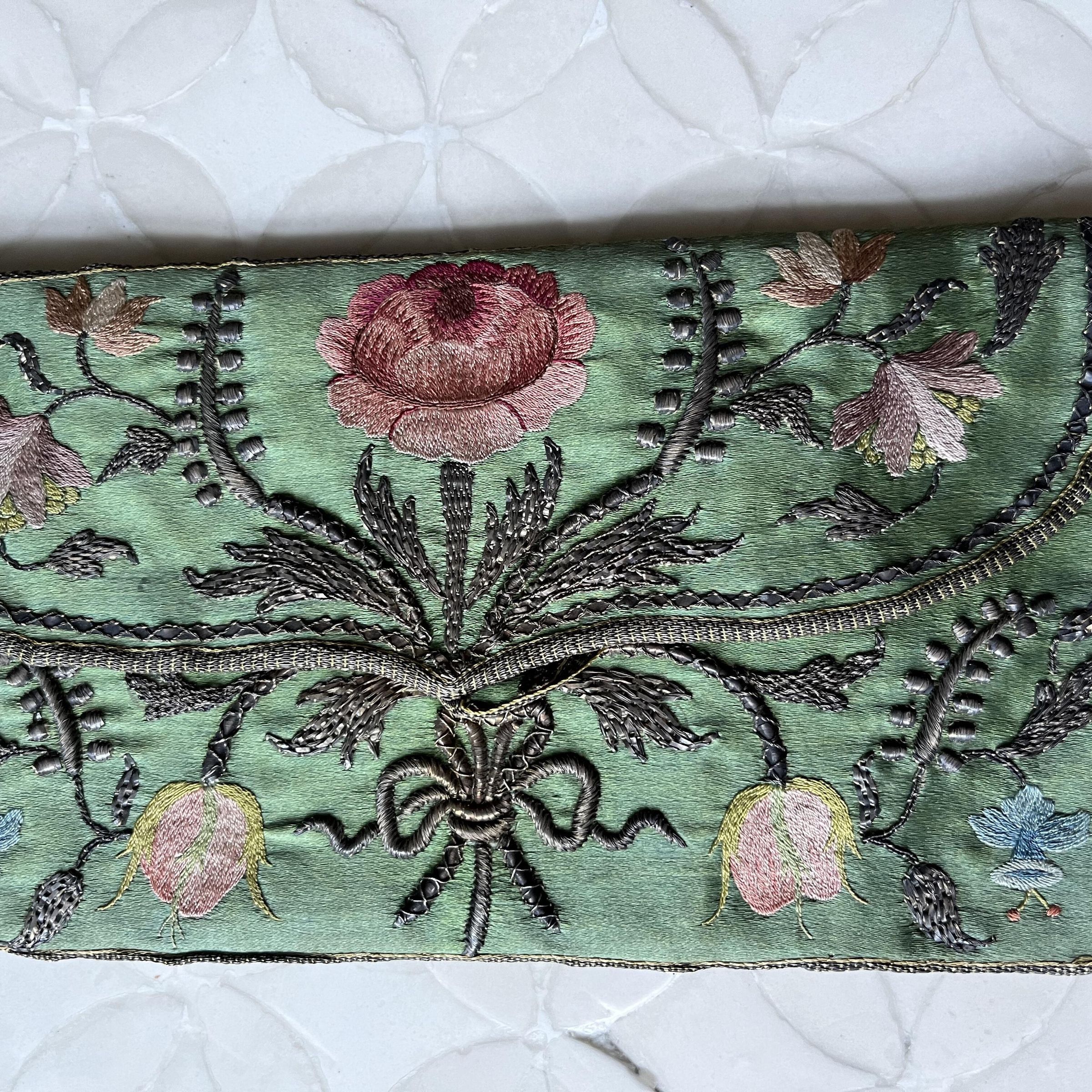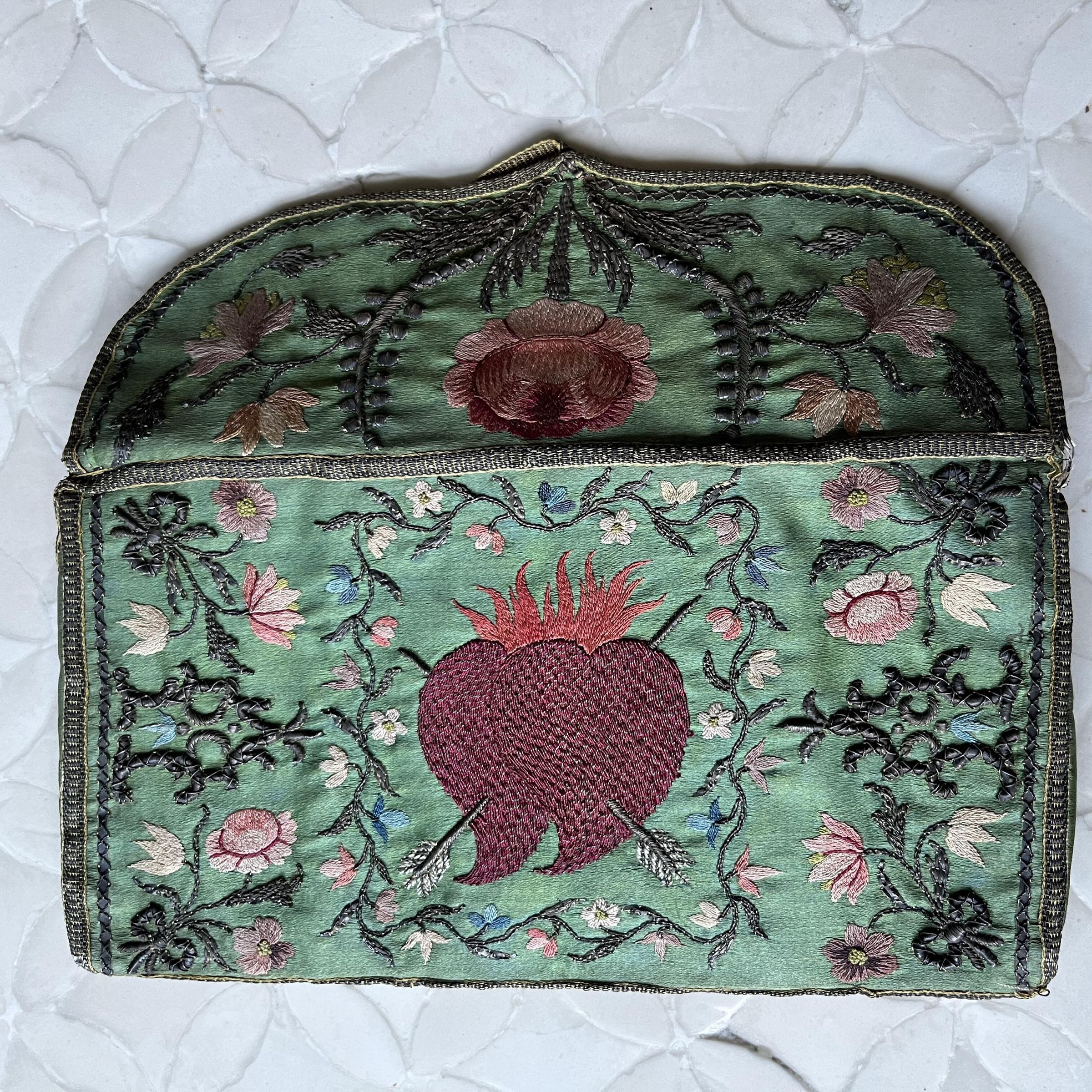 Green silk satin with embroidered floral design and central pair of flaming hearts on reverse. The interior compartmentalized interior is lined with pink silk brocade. The complex embroidery includes metallic wrapped core (bullion), elaborate couching, and fine shaded embroidery.Use