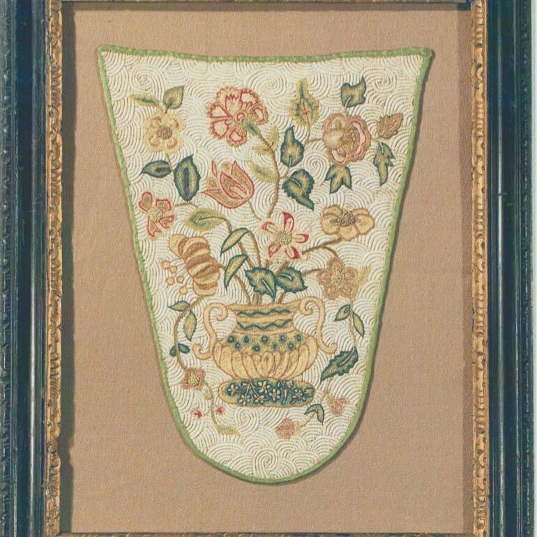 Fashionable American and English ladies of the 18th century wore stomachers, decorative fabric panels that formed the center portion of the bodice of a gown, emphasizing the cone shape desirable in the female bodice of that period. These could be plain, printed, or, occasionally, embroidered. This is stomacher with its richly worked composition of a decorated two-handled urn holding a graceful display of flowers, set against a quilted background. A publication from Colonial Williamsburg, What Clothes Reveal: The Language of Clothing in Colonial and Federal America by Linda Baumgarten discusses this form and illustrates several stomachers, both printed and embroidered, as figures 19 and 162.