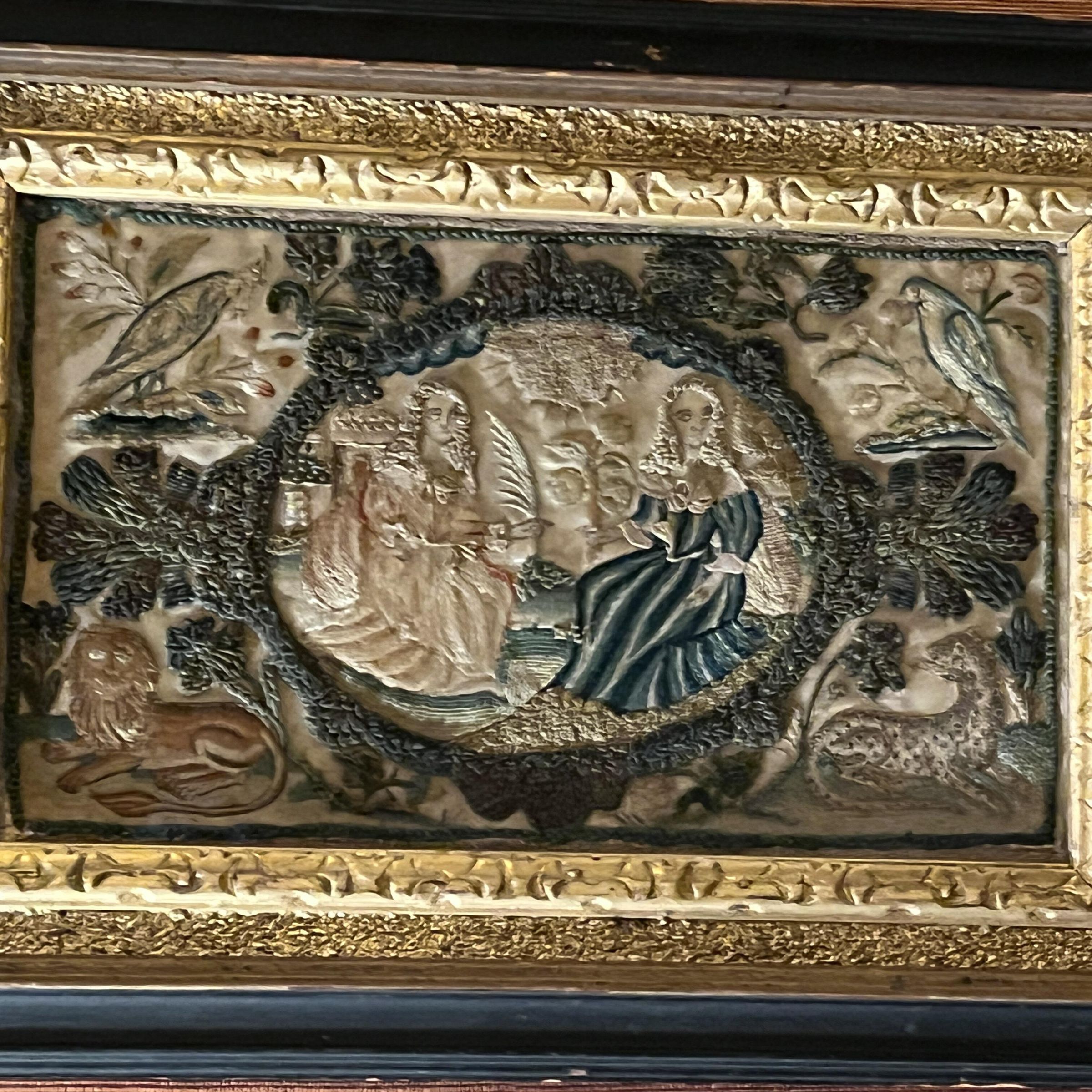 In 17th century England, it was the culmination of a young girls education to create a casket (a box), most often with Stumpwork embroidery adorning the box. Allegorical figures were popular themes for the scenes on these embroideries. Here we have two female figures representing Spring and Fall. The lion and leopard in the lower corners are found in many of these embroideries in the same locations as on this embroidery. The cartouche is masterfully stitched in metal threads, including silk wrapped purls.Collection
