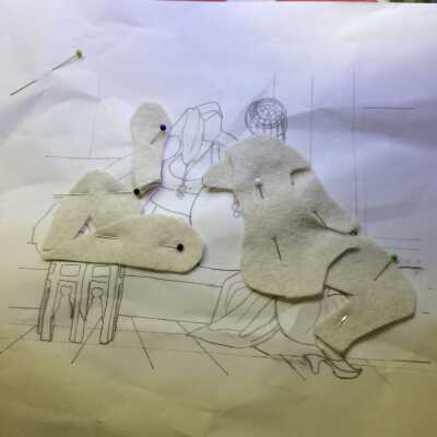 Two female stumpwork figures seated in conversation