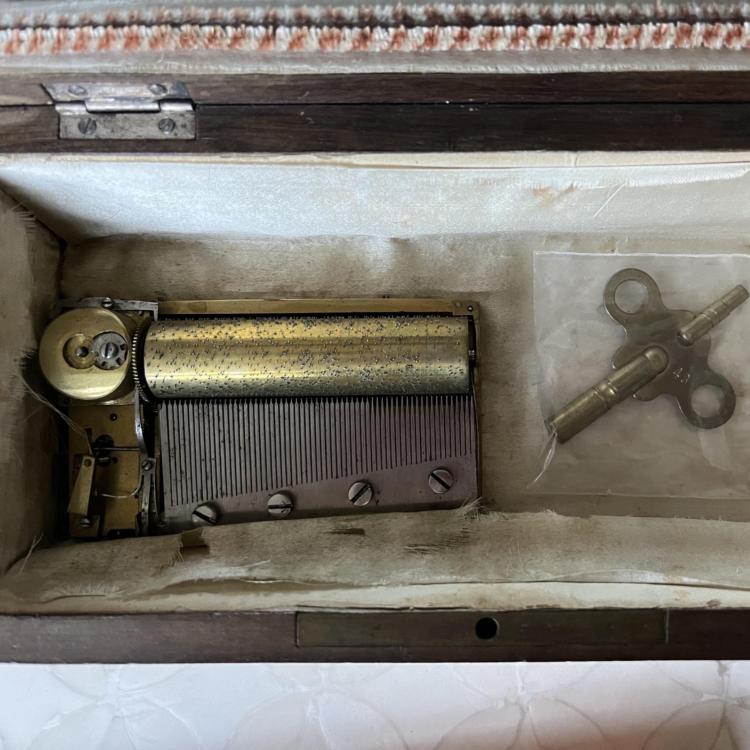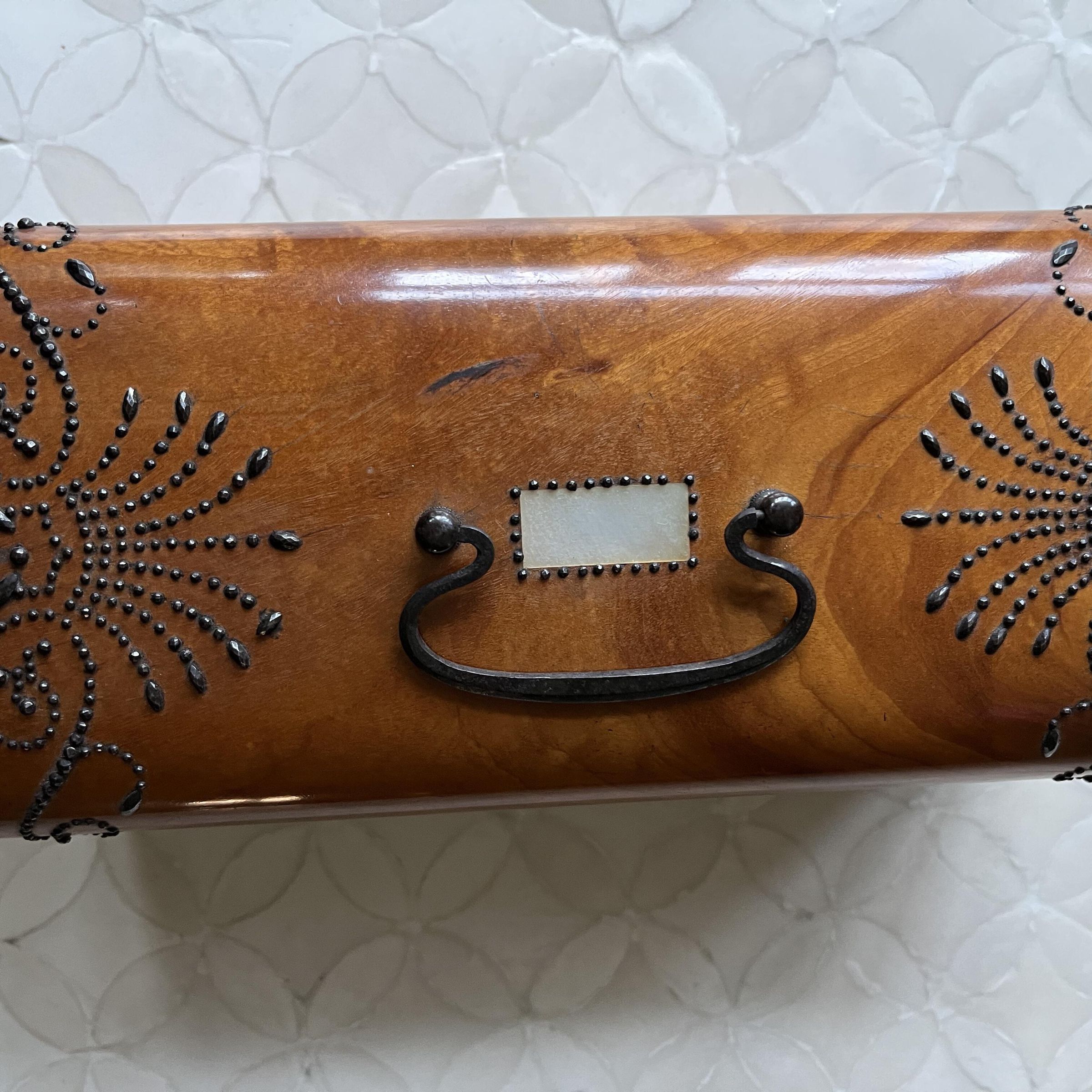 In the early 18th century, European workboxes were decorative and elaborate objects with mother-of-pearl, ivory, gold or brass fittings. Boxes had lift-out trays lined with velvet or satin with receptacles formed for specific tools (thimbles, scissors, and bodkins, for example.)