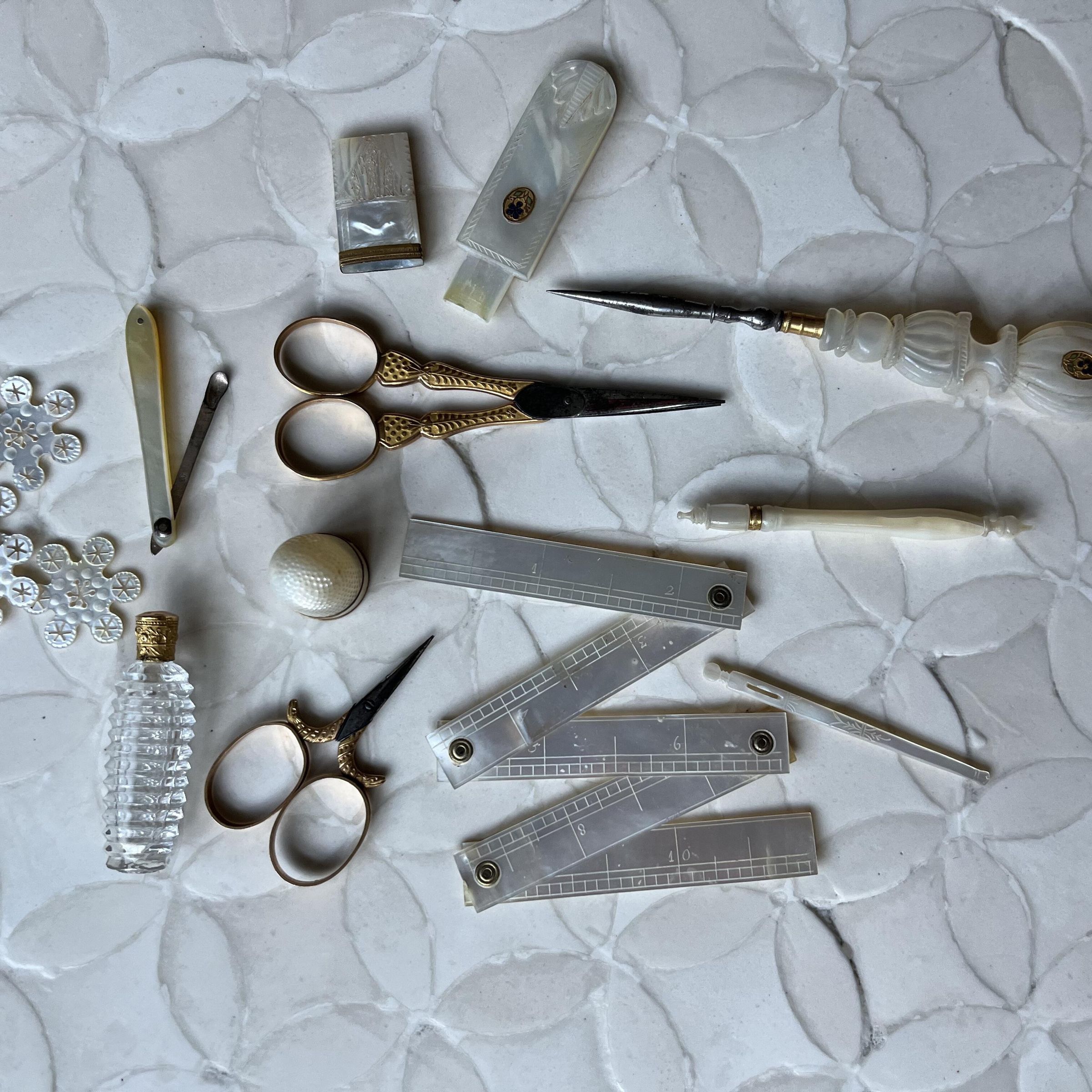 Mother-of-pearl, Needlework tools, Scissors, Sewing box, Sewing tools, Stiletto, Tape measure, Thimble, Thread winder, Palais Royale, Music boxDescription