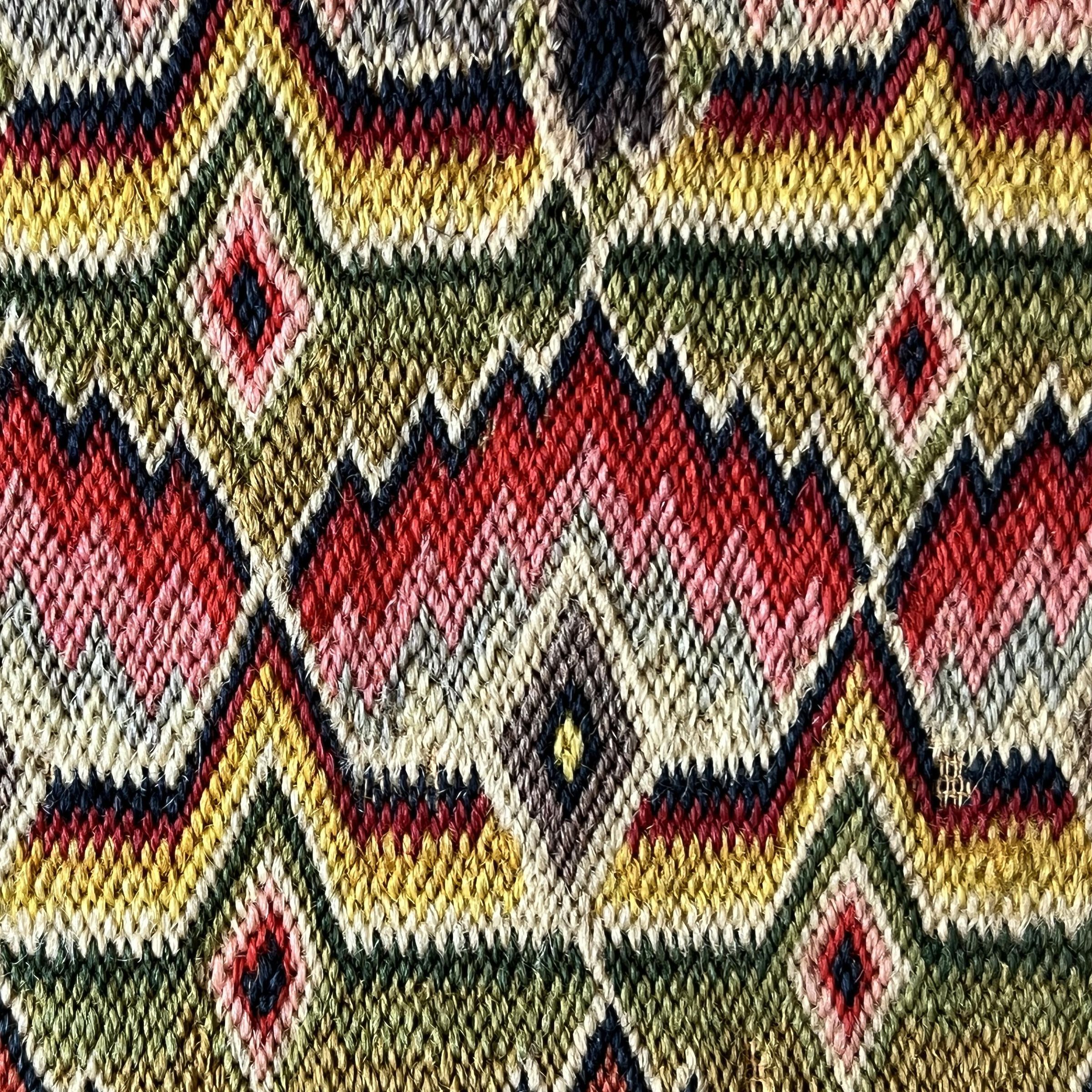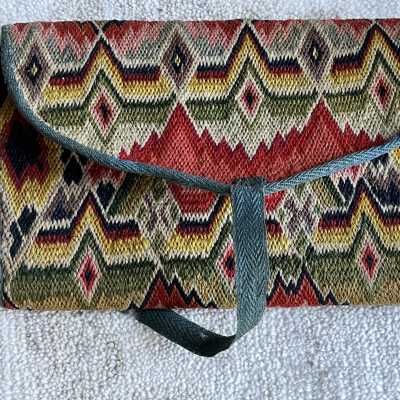 Envelope-shaped triple fold pocketbook with curved flap in wool on canvas in Flame stitch. Stiff paper (light cardboard) faced with canvas work and lined in pink silk. Two dividers, stiffened by paper and lined with pink silk, one is attached to main body by two pink silk gussets to each side, and the other is attached along the back with a tiny gusset. All edges bound with green cotton tape. Attached to front flap is green cotton tape approximately 9" long. Canvas work is a zig-zag pattern with diamonds (Flame stitch) in yellow, green, red, purple, and blue wool thread.Use