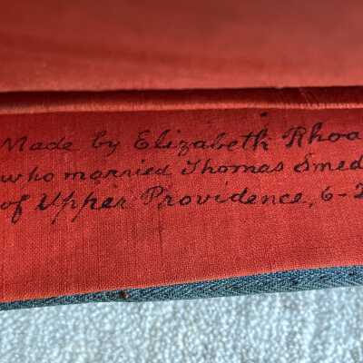 Made by Elizabeth Rhoads/who married Thomas Smedley/of Upper Providence, 6-20-1776Language