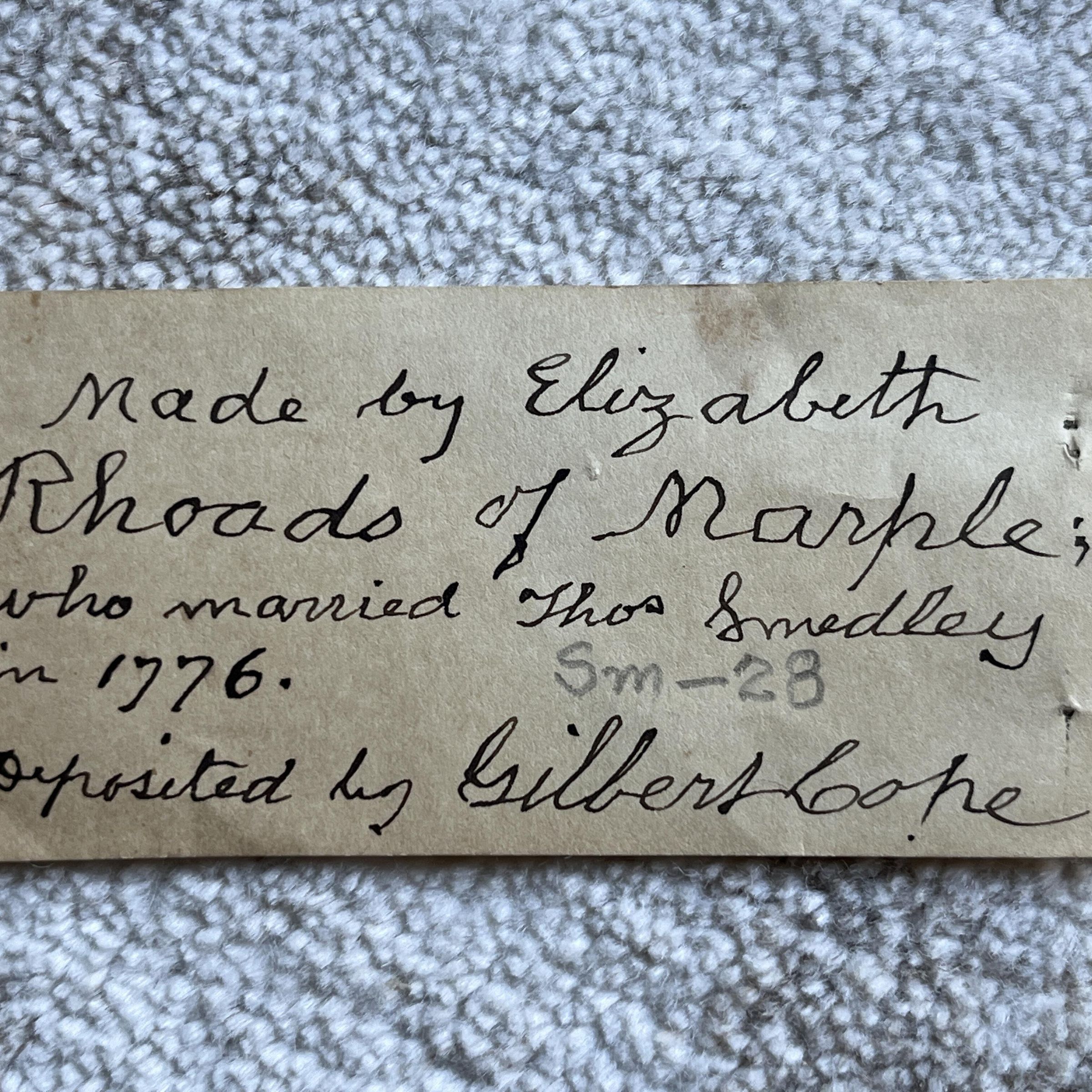 3-1/2 in x 1-1/2 in paper inscribed: Made by Elizabeth/Rhoads of Marple/who married Thos Smedley/in 1776./Deposited by Gilbert CopeCondition