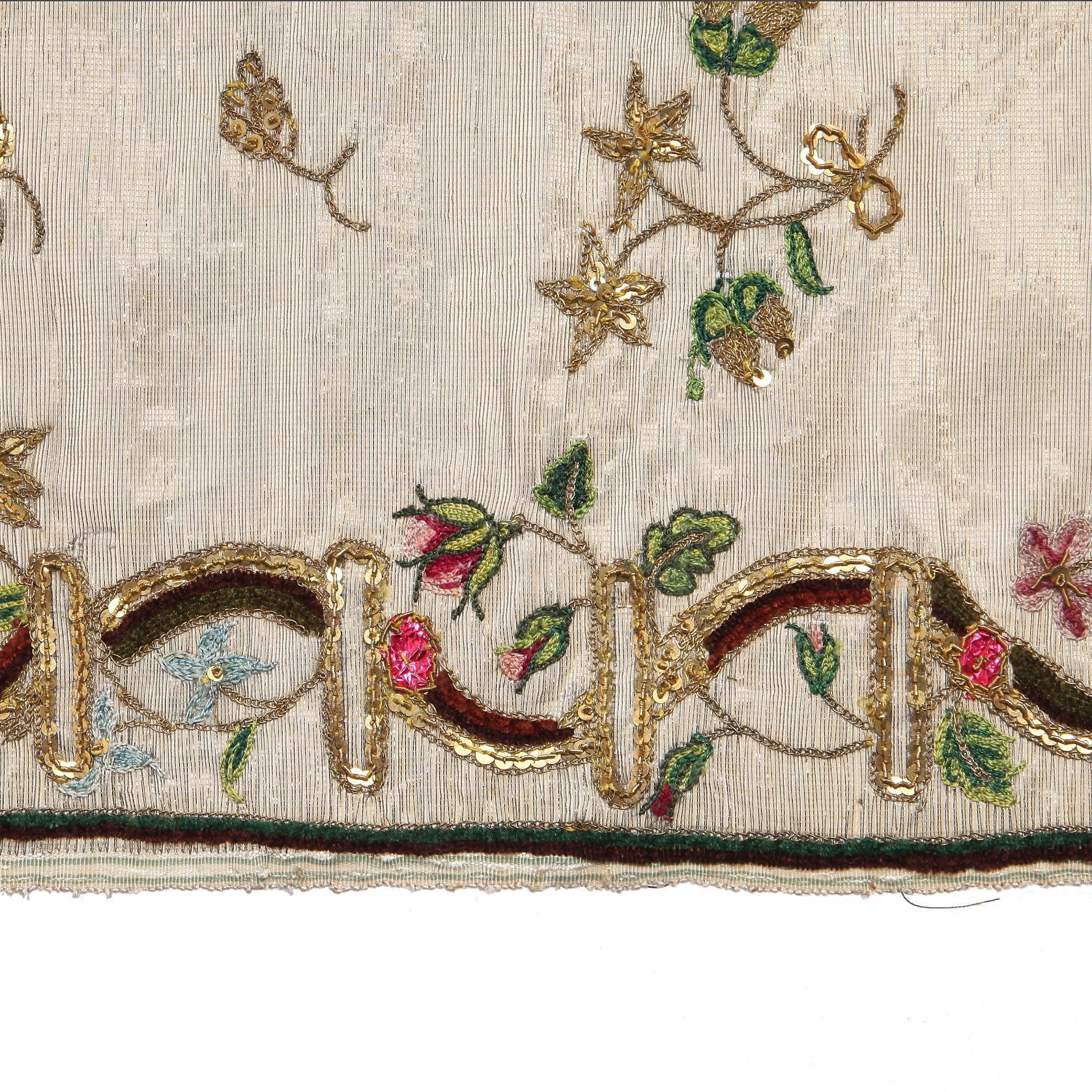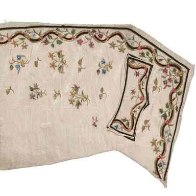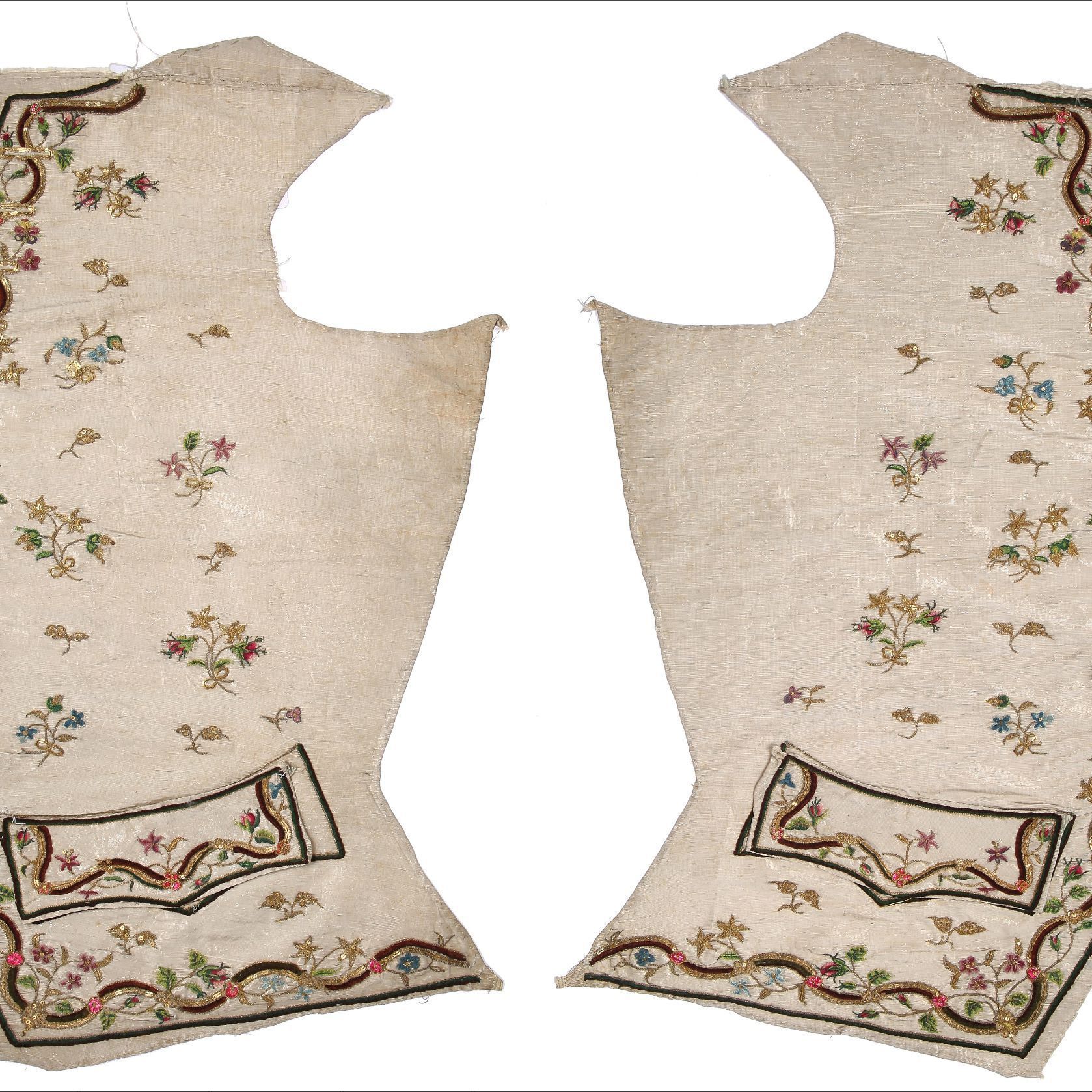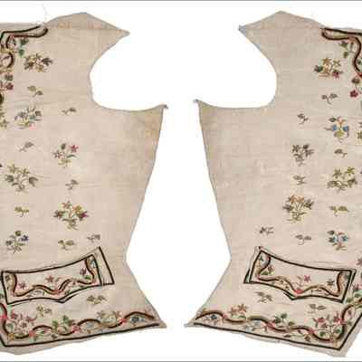 Embroidered but unfinished gentlemen's waistcoat panels, probably French, 1770s, - of woven ivory silk embroidered with undulating bands of gold thread and green and brown chenille, pink foil blossoms, periwinkles and briar roses worked in chainstitch silks and gold thread, the pocket flaps are loosely applied, the button-holes are uncut, each chest panel 42cm, 16 1/2in wide (2) (Qty: 2)Collection