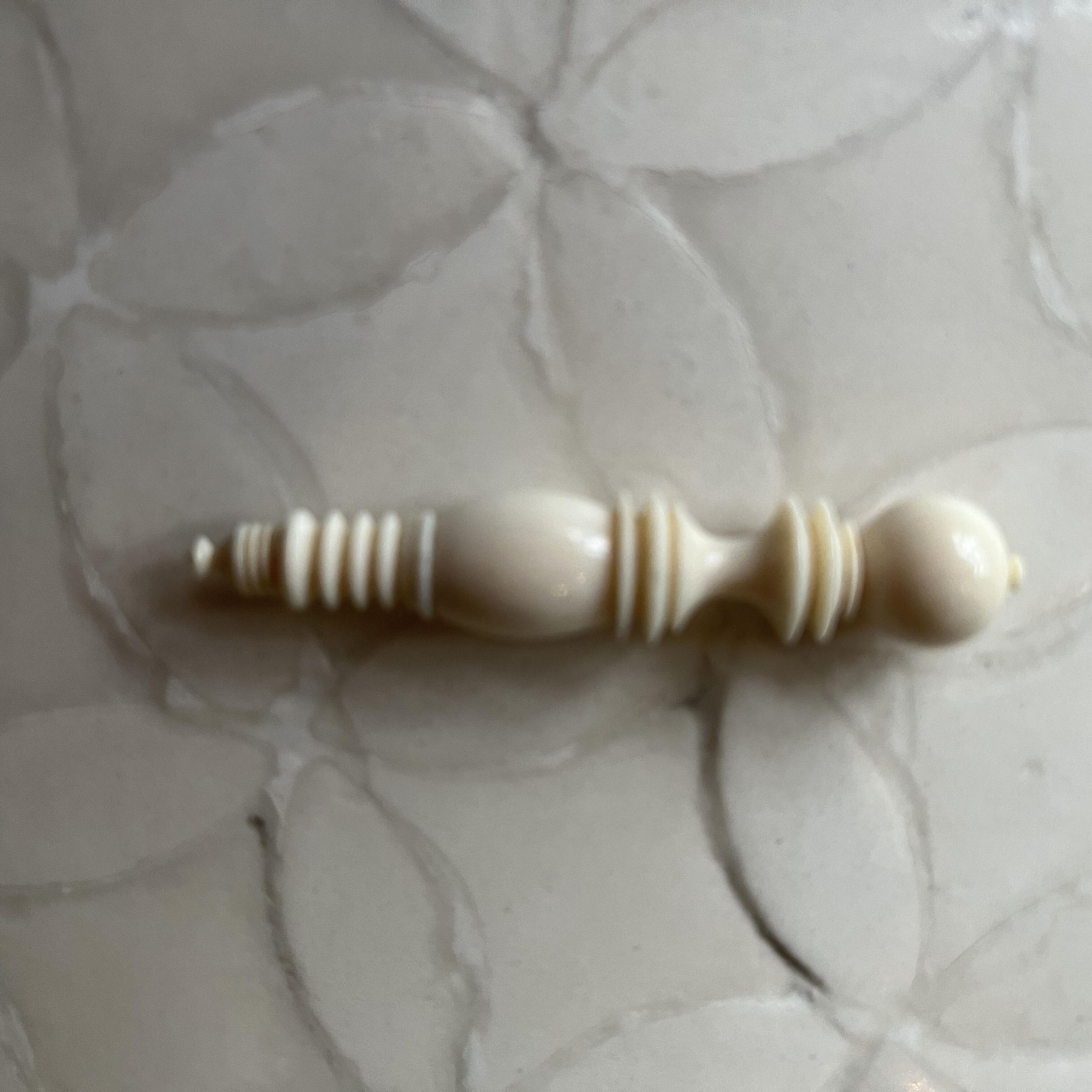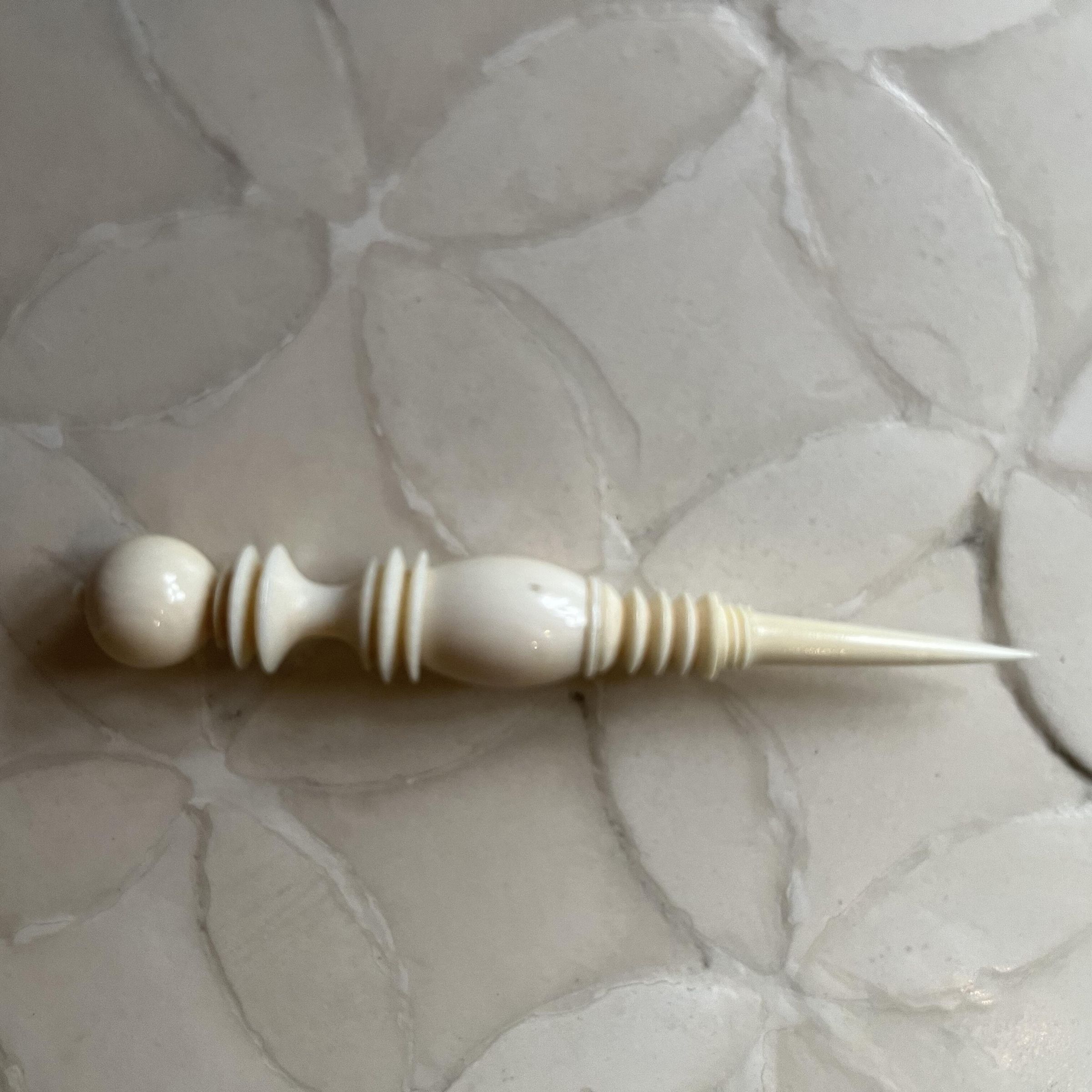 A turned ivory capsule that when unscrewed, reveals a stiletto. The unscrewed cap screws back onto the stiletto base to form a handle for the toolUse