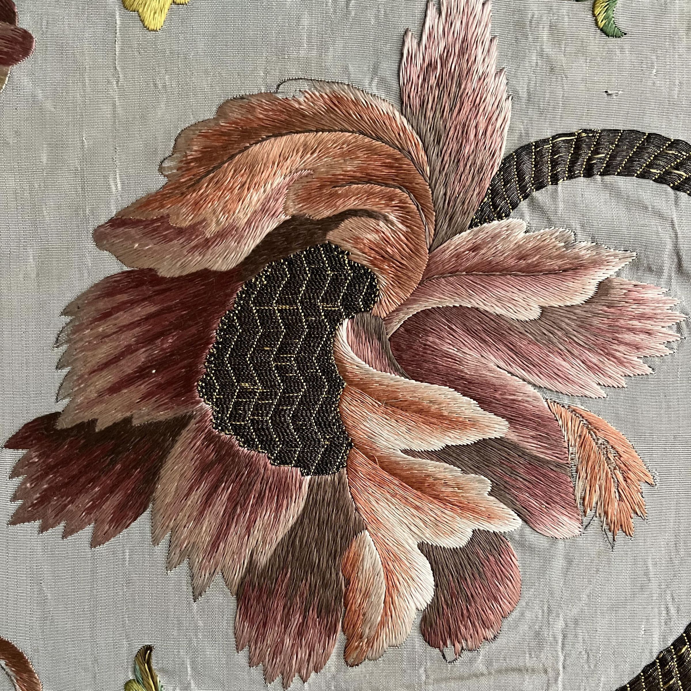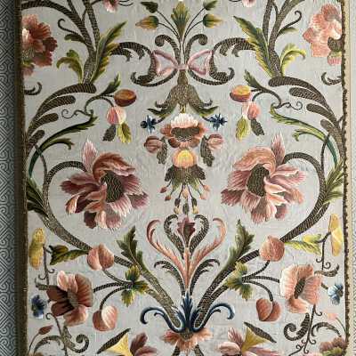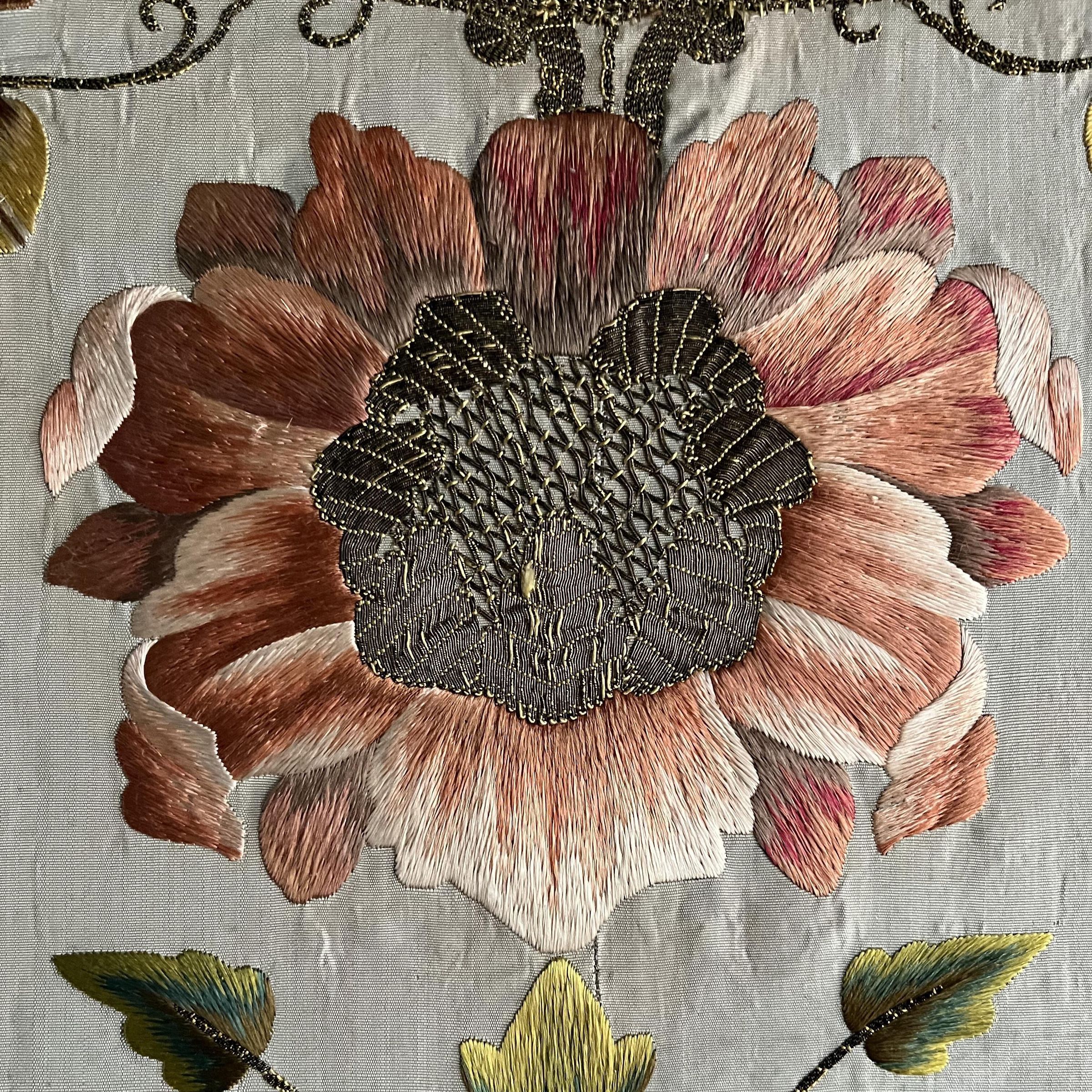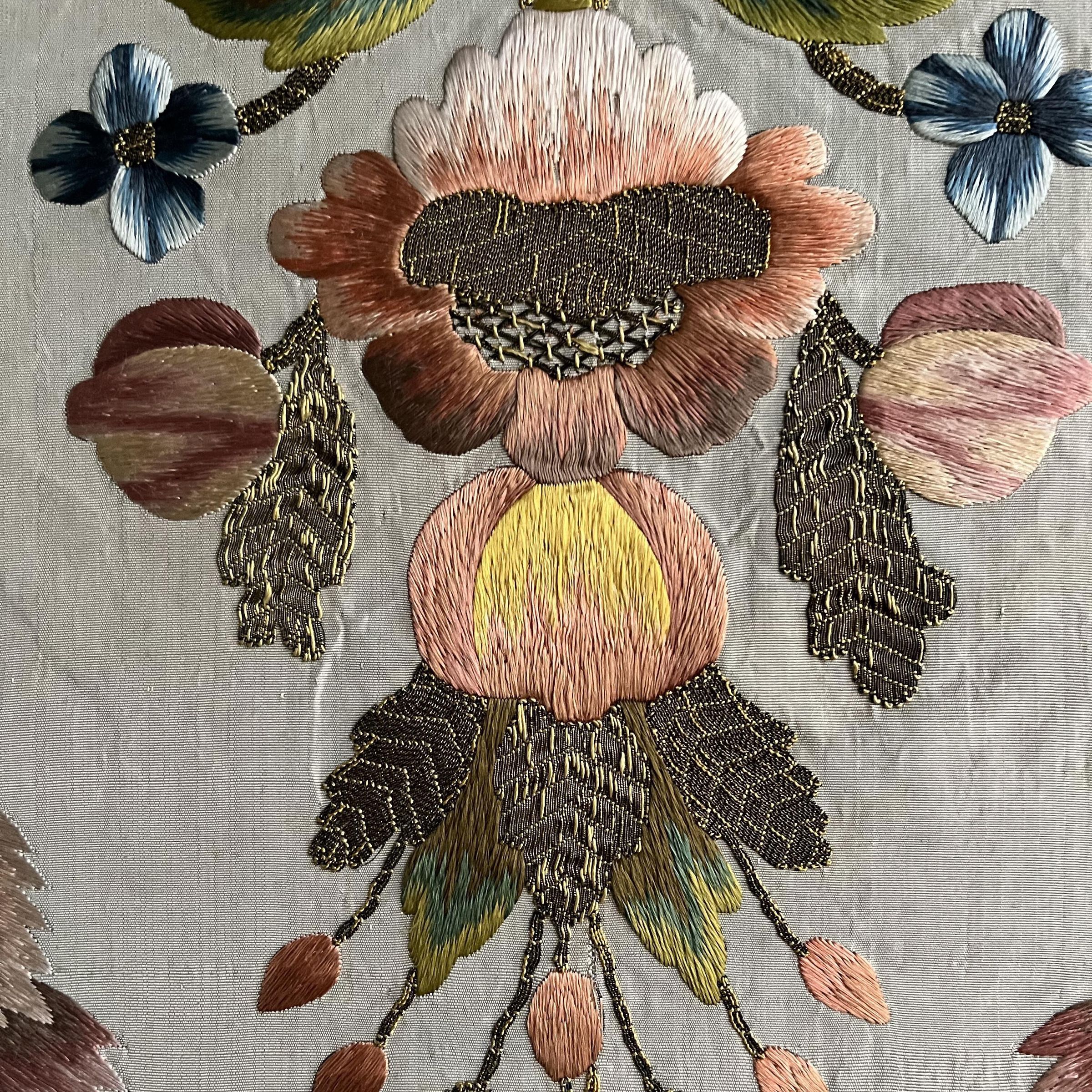 Pale blue silk faille chasuble back with polychrome silk embroidery of large flower heads and leaves with metallic centers, stems, and vines; stretcher mount; unframedUse