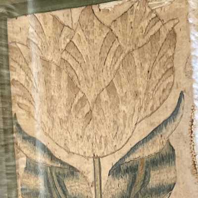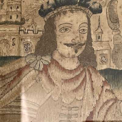 Two large needlepainted flowers flank a couched raised cartouche showing a needlepainted nobleman in front of a castle holding a staff or shepherd's crook. In a molded oak frame with a green velvet mat.Use