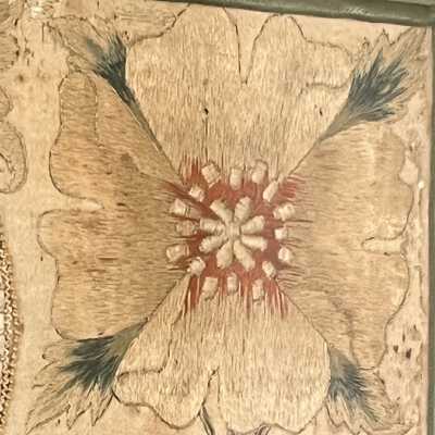 In 17th century England, it was the culmination of a young girls education to create a casket (a box), most often with Stumpwork embroidery adorning the box. The scene of this embroidery is typical of the motifs and scenes found on these caskets. The lady possibly represents the sense of scent, as she is holding a flower.Collection